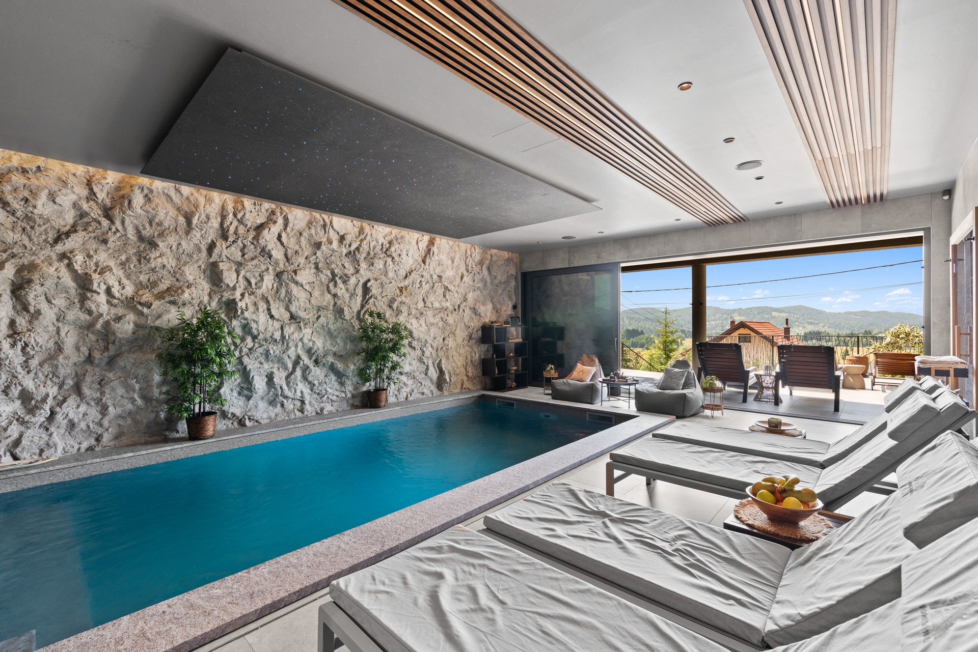 Središnji dio wellnessa je unutarnji bazen, grijan na konstantnih 30°C. Ta temperatura omogućuje opuštanje i odmah stvara osjećaj ugode, što je posebno cijenjeno u hladnim mjesecima. Sustavi podnog i zidnog grijanja te ventilacija koja upuhuje topli zrak dodatno osiguravaju konstantnu klimu prostora, bez naglih promjena. Velike staklene stijene otvaraju pogled na brežuljke i doline Gorskog kotara, tako da boravak u bazenu nije izolacija od prirode, već produžetak njezinog okruženja. Gosti često iznenađeno komentiraju da nisu očekivali da će u kući za odmor doživjeti ovakvu razinu udobnosti. Mnogi se uspoređuju s boravkom u alpskom resortu, i to usred Hrvatske.