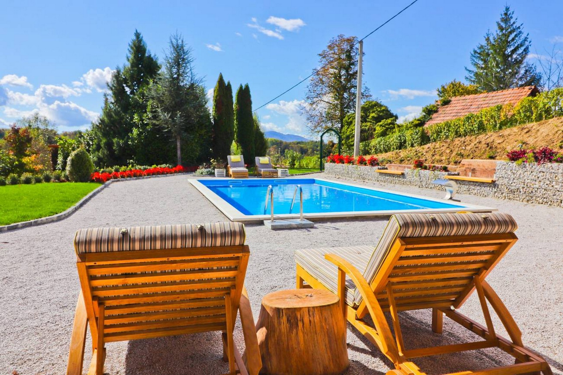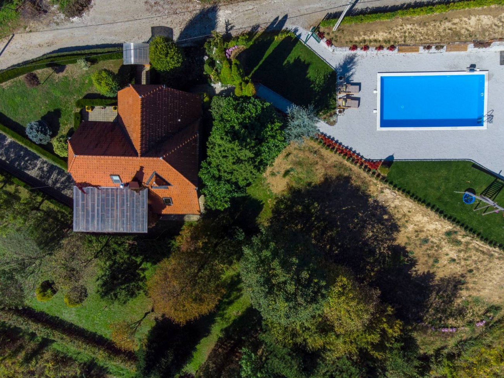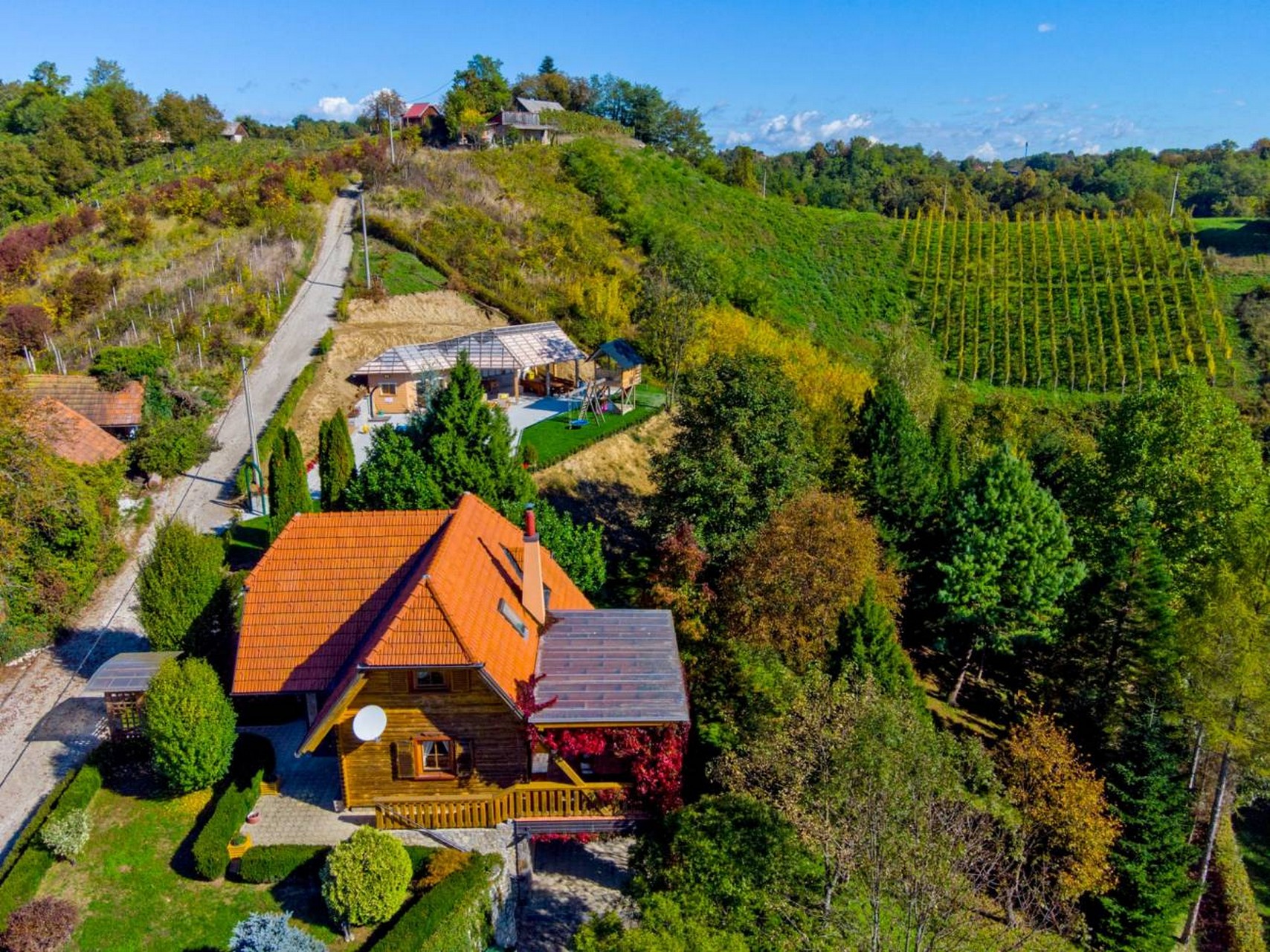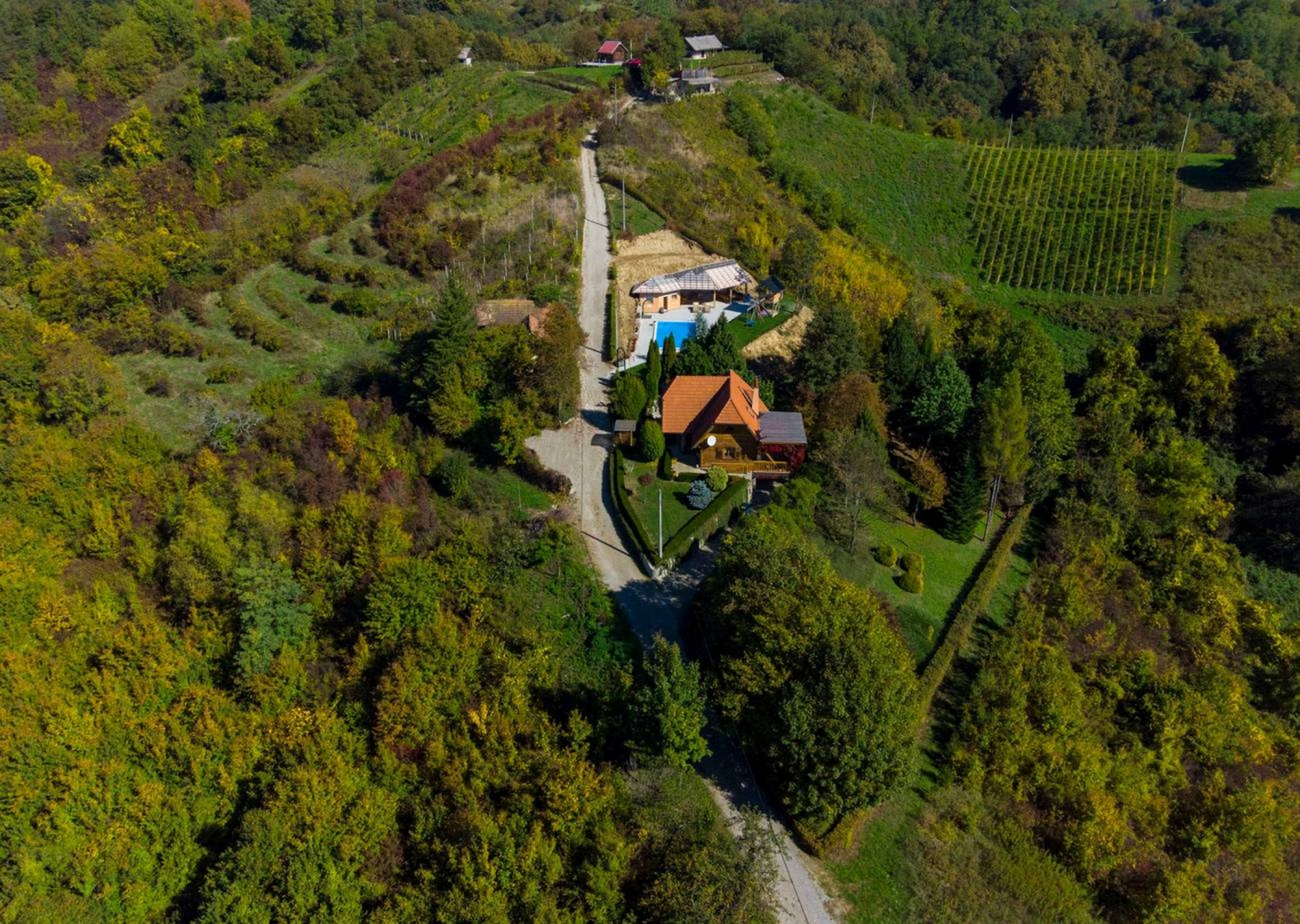 Kuća s tri spavaće sobe i bazenom nalazi se u malom mjestu Gornja voća, u Hrvatskom zagorju na granici sa Slovenijom. Udaljena je samo 22 km od prekrasnog grada Varaždina.