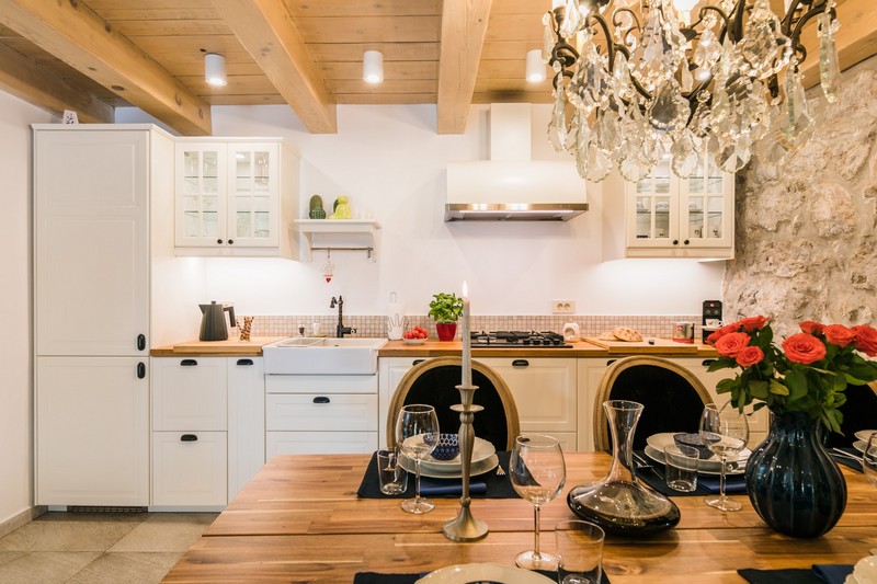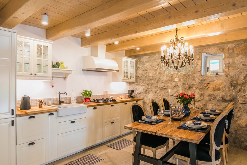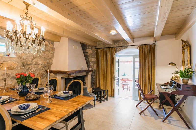 U prizemlju vile su dnevni boravak, kuhinja i blagovaonica s otvorenim kaminom, otvorene prema vrtnoj terasi.
