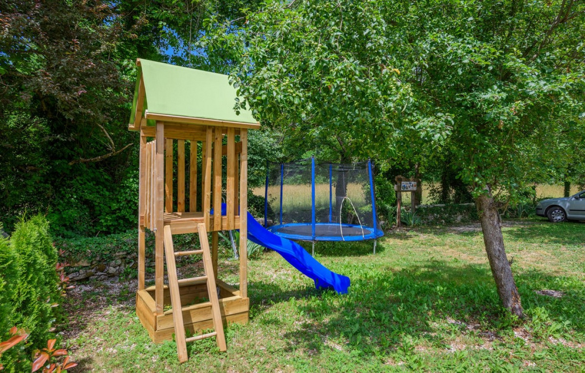 U ograđenom dvorištu se nalaze privatni bazen (8 x 4 m) s ležaljkama i natkrivena terasa s vanjskom garniturom, roštiljem i sudoperom. Bazen se može koristiti od sredine svibnja do kraja rujna, ovisno o vremenskim uvjetima. Za djecu su dostupni ljuljačka, klackalica i penjalica, a trampolin i tobogan smješteni su preko puta kuće.