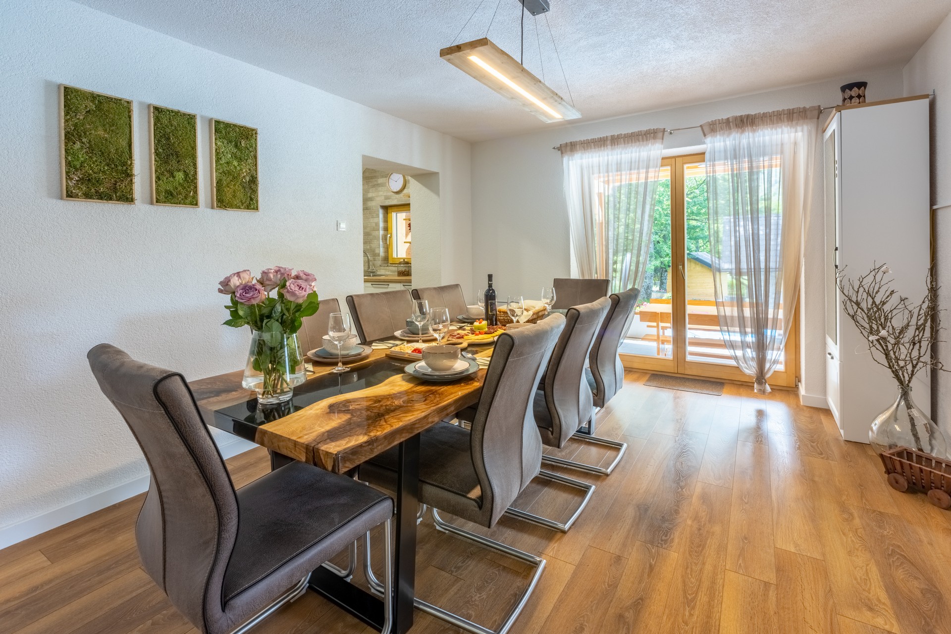Kuhinja je potpuno opremljena za pripremu i serviranje hrane, uključujući hladnjak, pećnicu, mikrovalnu, perilicu posuđa, aparat za kavu, kuhalo za vodu, blender, štapni mikser, sjeckalicu, čaše za vino, pribor za jelo, tjesteninu, začine i opremu za roštilj. Blagovaonica ima izlaz na terasu, a za najmlađe je dostupna hranilica za bebe.