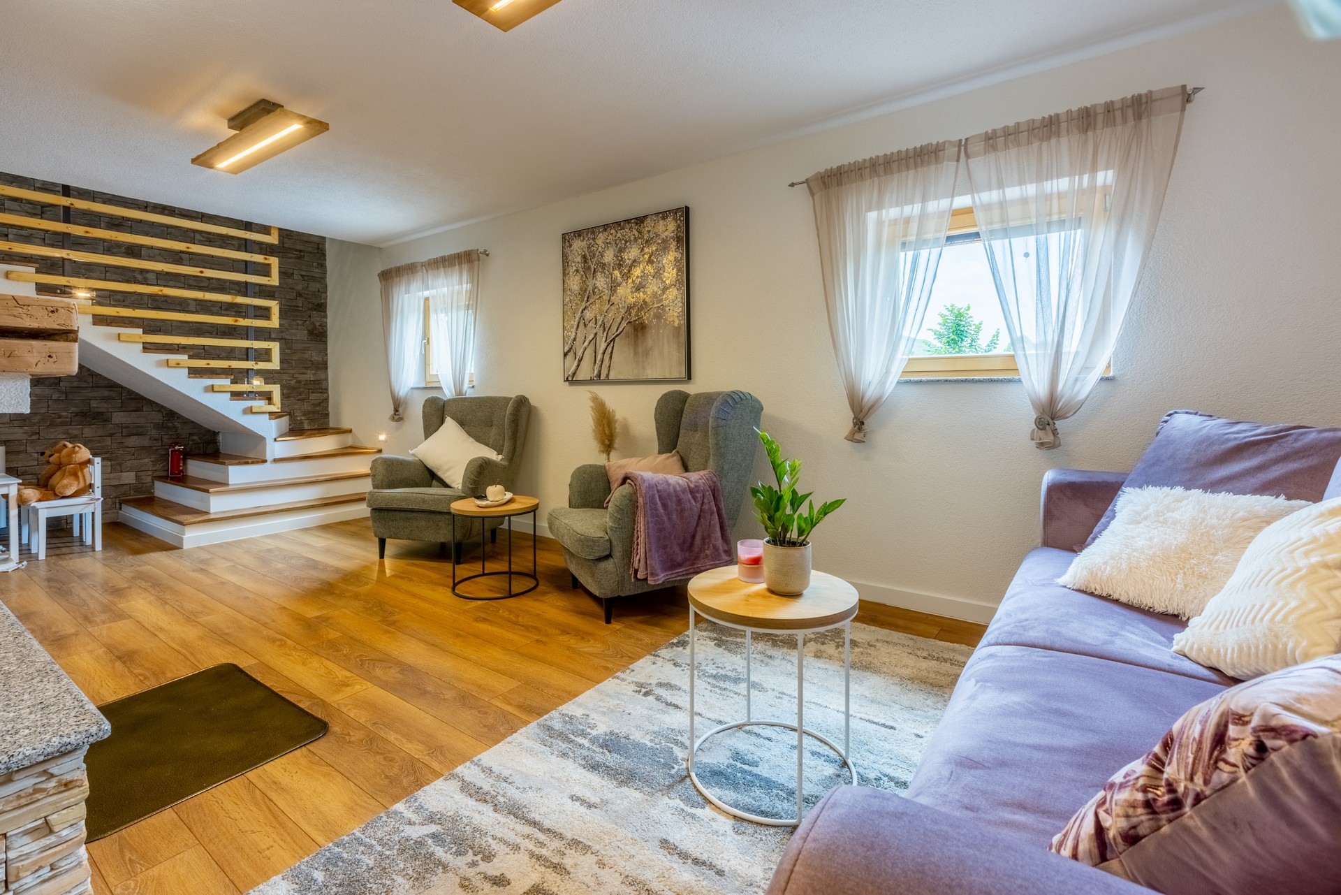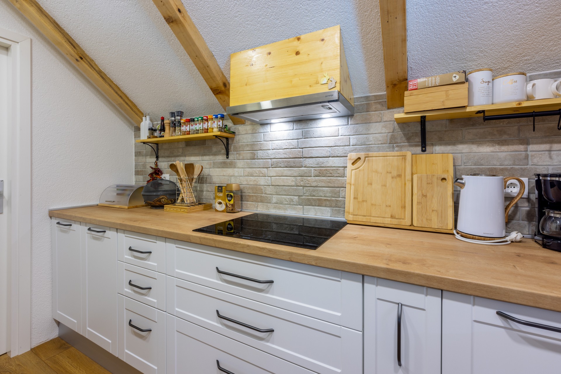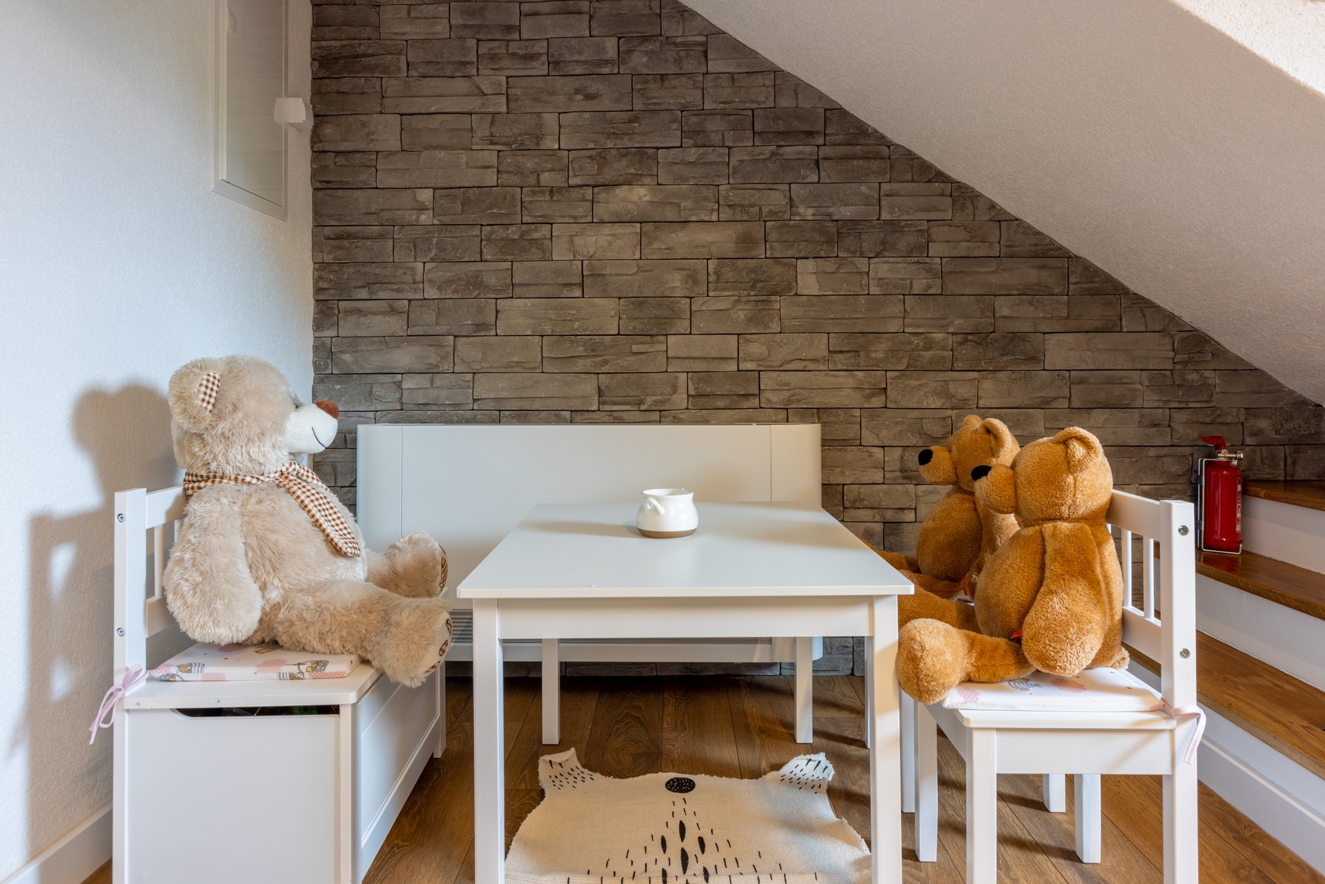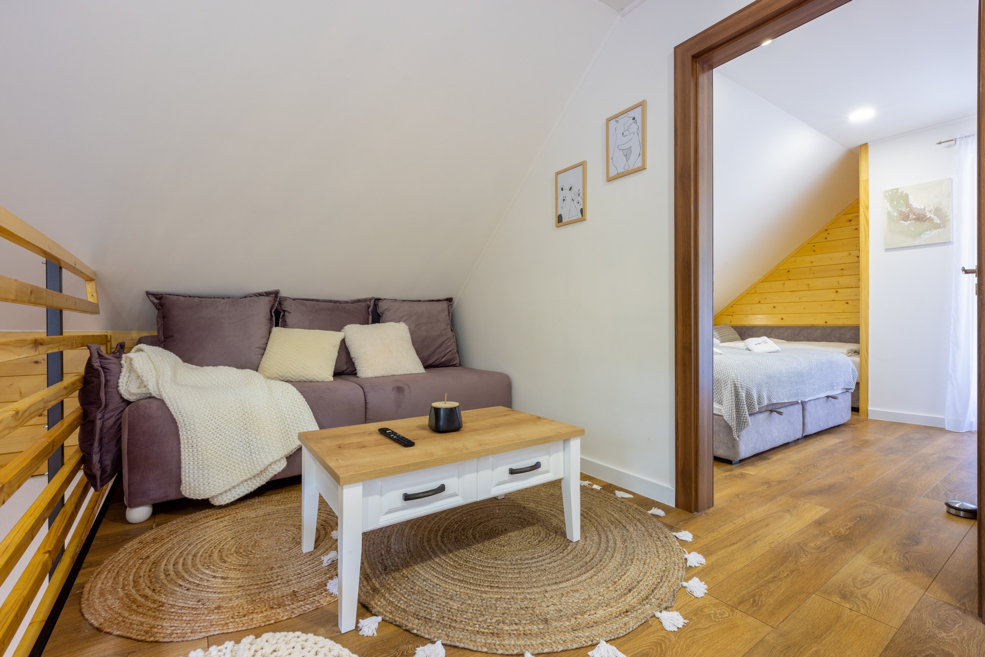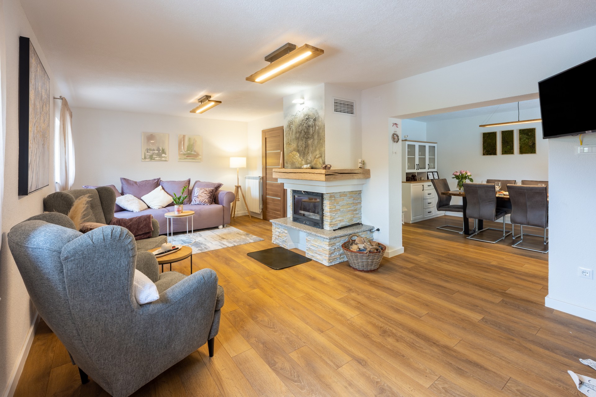 Dnevni boravak nudi udobne sofe i fotelje, kamin, dječji kutak s igračkama i društvenim igrama te Smart TV za opuštanje i zabavu. Natkrivena terasa dodatno omogućuje uživanje u kaminu, roštilju i peki, uz stol i klupe te sudoper i drva s briketima.