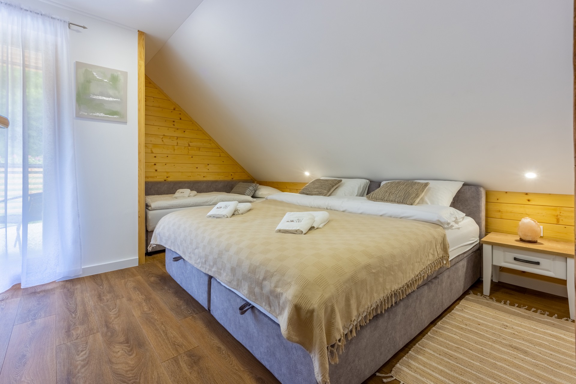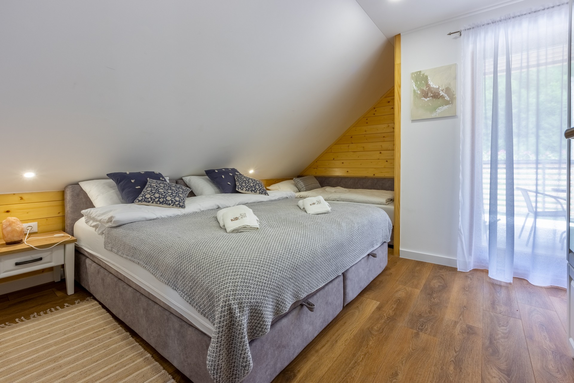 3 spavaće sobe osiguravaju udobnost za sve goste, a uz ručnike, posteljinu i ogrtače, na raspolaganju je i dječji krevetić. 2 kupaonice i dodatni toalet nude walk-in tuš, hidromasažnu kadu, osnovne higijenske potrepštine, sušilo za kosu, ručnike i ogrtače, kao i perilicu i sušilicu rublja.