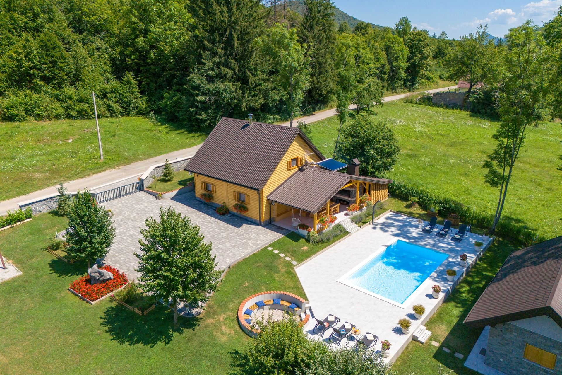 U prostranom dvorištu nalazi se grijani bazen s ležaljkama, vanjski tuš, ložište, parking, dječje igralište, sportski sadržaji, bicikli, ekološki vrt i EV punjač. Wellness prostor obuhvaća jacuzzi, finsku saunu, slanu sobu s Himalajskim zidom soli, kupaonicu i zvučnik.