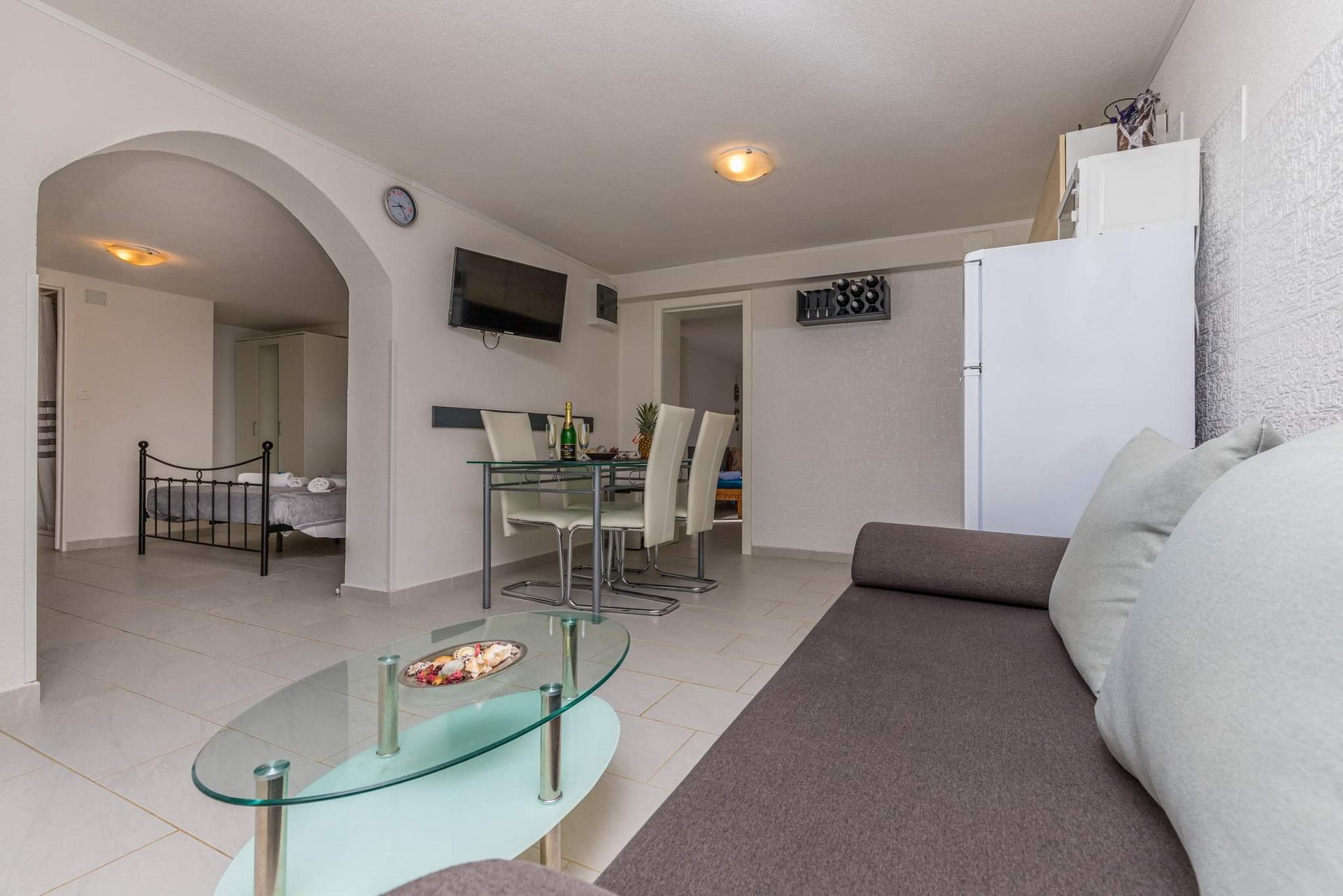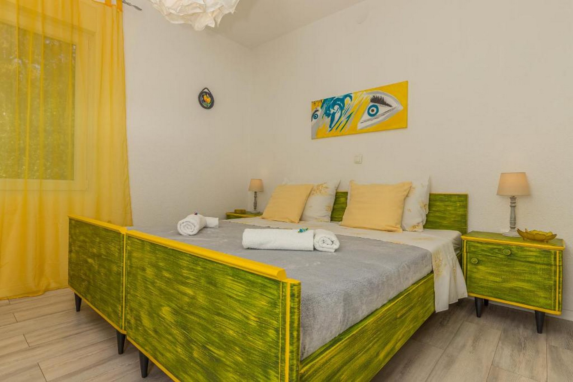 Veći apartman na prvom katu ima 2 spavaće sobe - jedna s bračnim krevetom, dječjim krevetom i dodatnim krevetom 90x200, a druga s bračnim krevetom te prostranu kuhinju i dnevni boravak.