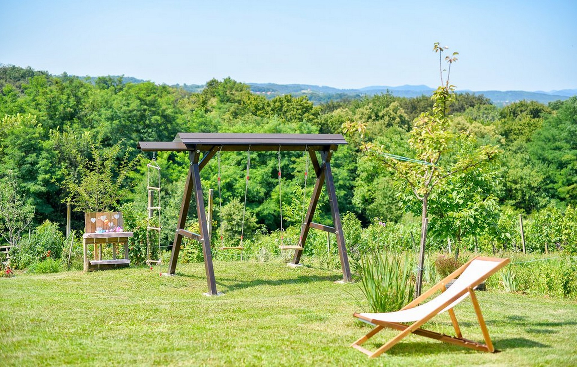 Dodatni sadržaji uključuju ljuljačku, pješčanik, konstrukciju za penjanje, mrežu za badminton, 2 gola za nogomet, 2 reketa za badminton te 2 bicikla.
