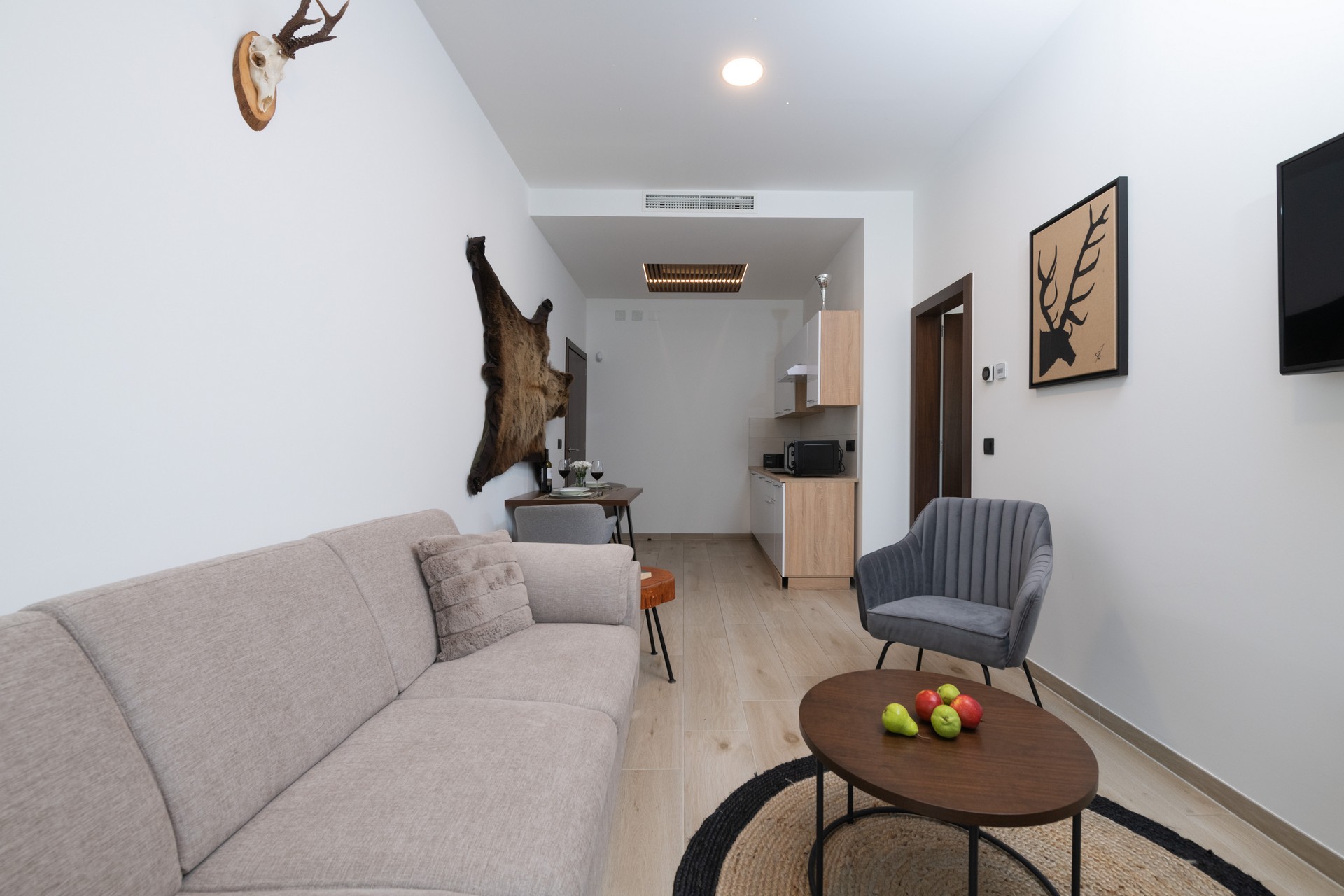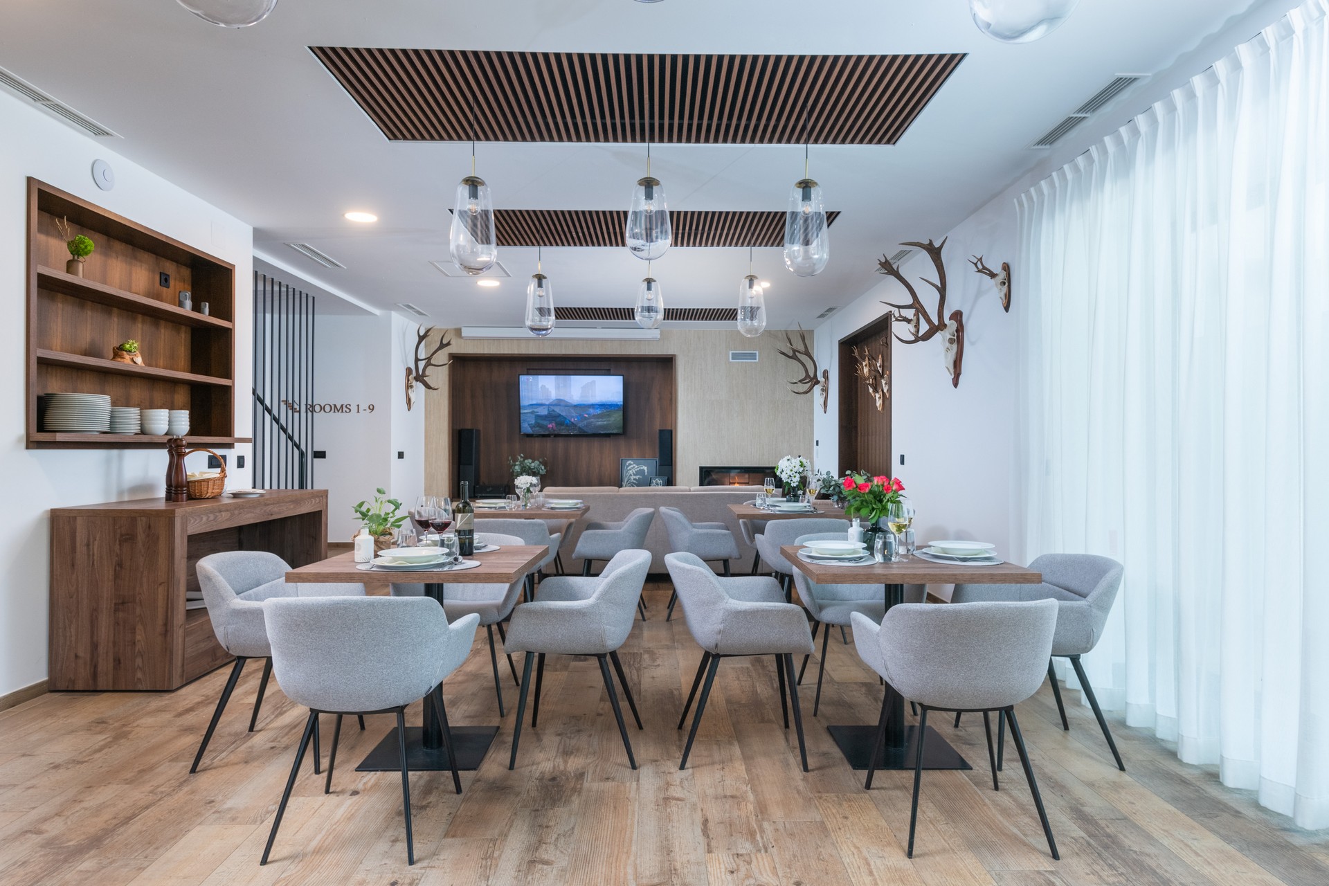 Prostrani zajednički dio obuhvaća ugodan dnevni boravak s TV-om, blagovaonicu i bar, pružajući idealan prostor za druženje ili neformalna poslovna okupljanja. Doručak je uključen u cijenu boravka, uz mogućnost organizacije polupansiona na upit.