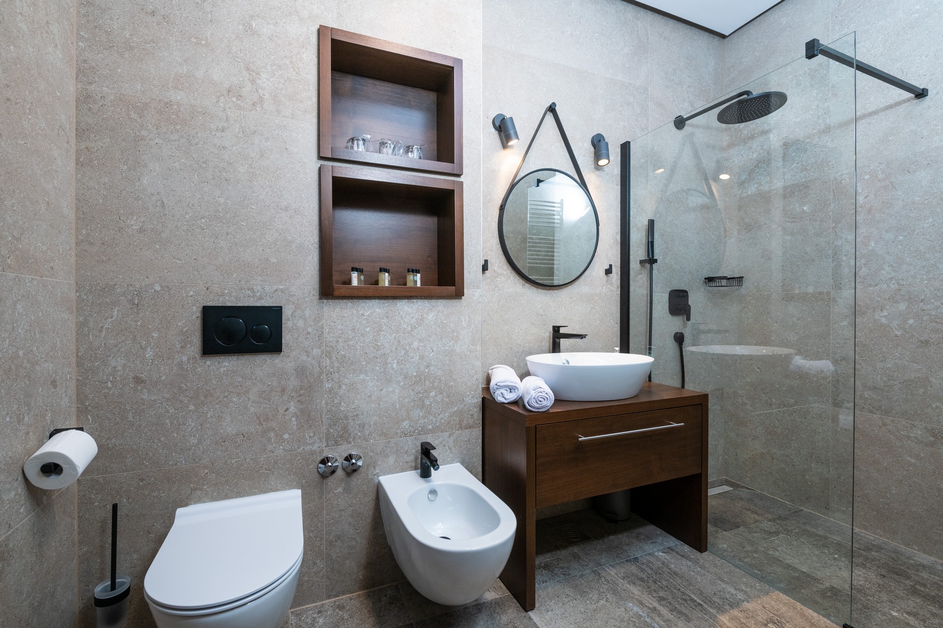 Ukupno je na raspolaganju 9 kupaonica te dodatni zajednički toalet u prizemlju. Kreveti se prema potrebi mogu spojiti u bračni ležaj ili razdvojiti.