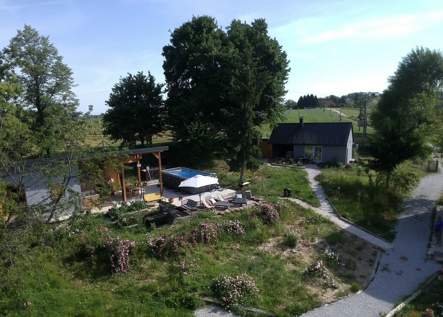 Imanje se prostire na 2 hektara netaknute prirode, s 1 hektarom okućnice bogato zasađene raznovrsnom hortikulturom u razvoju, organskim vrtom, šumom i slikovitim jezerom. Ispred kuće nalazi se ručno sađen voćaka, koje gosti mogu ubrati i kušati tijekom svog boravka.