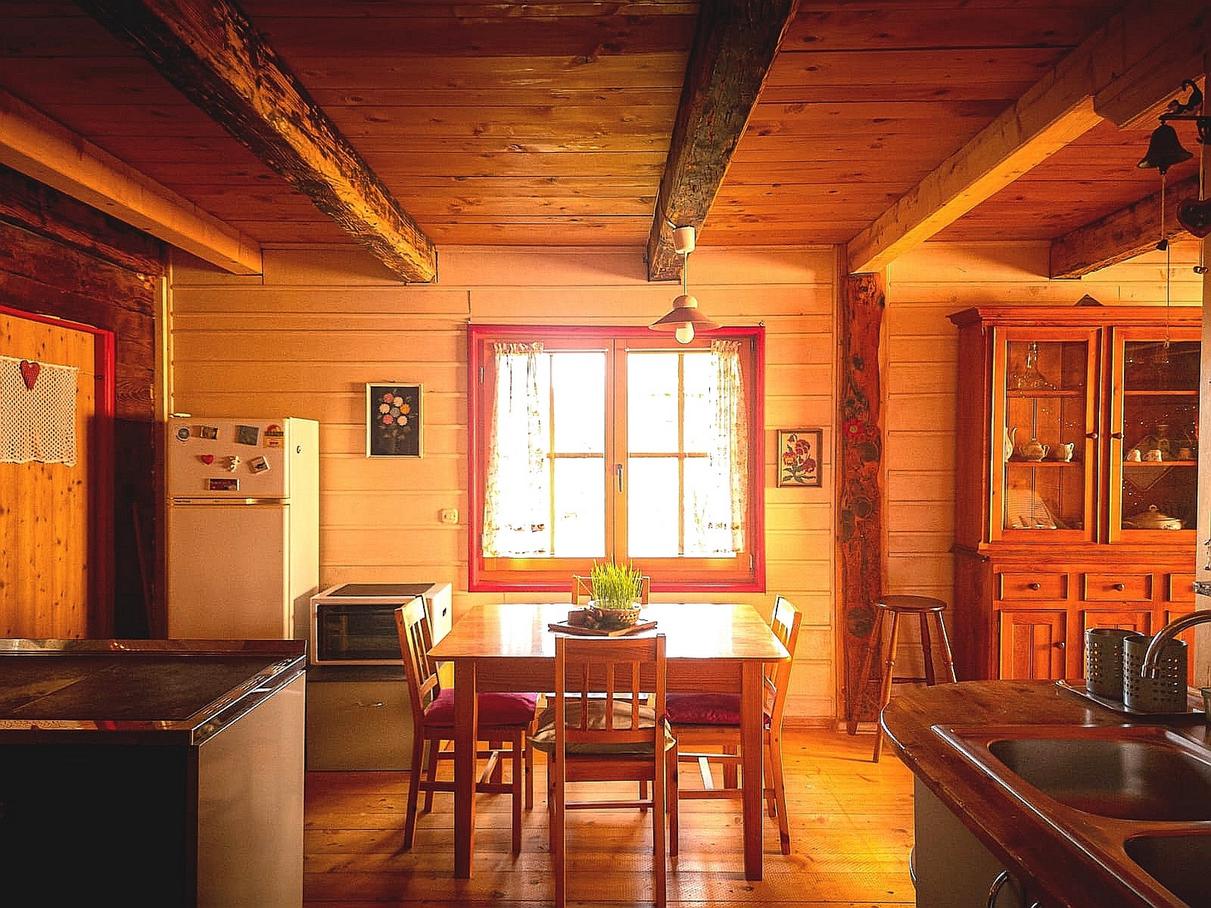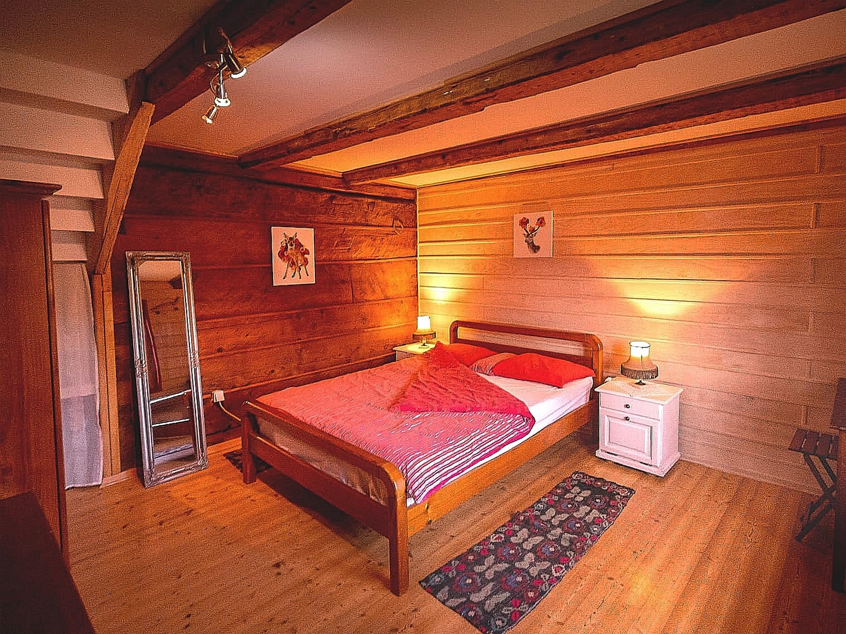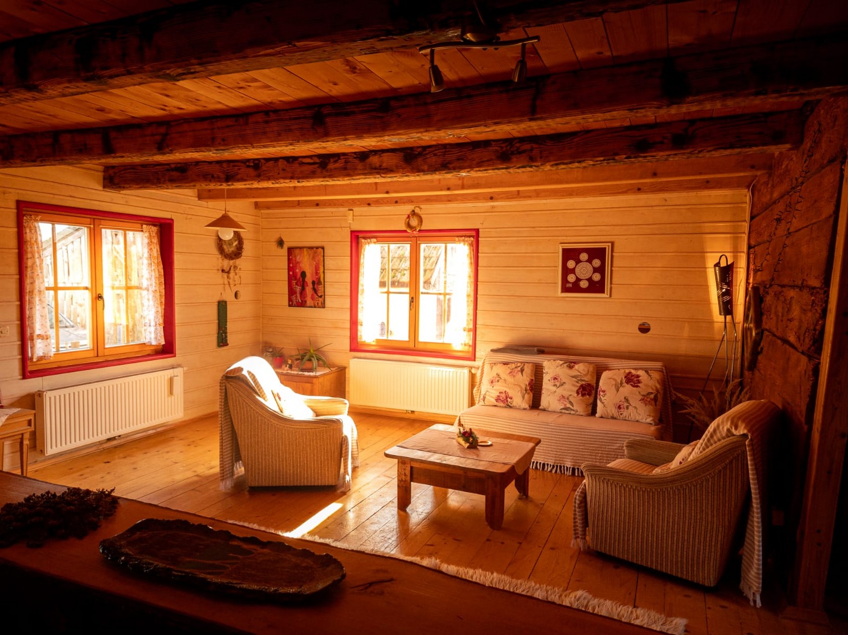 Kuća ima 108m2, peć na drva zimi za grijanje i kuhanje, jednu dvokrevetnu i jednu 2 jednokrevetnu sobu. Jedna soba u prizemlju je s pogledom na konje i šumu, dok je druga soba u potkrovlju s pogledom na vrt i šumu. Kuća također sadrži kauč za 2 osobe u vrlo prostranom dnevnom boravku s puno svjetla, wc i kadu te dobro opremljenu kuhinju. Ogromne otvorene zelene površine oko kuće za postavljanje, jelo, aktivnosti i užitak.