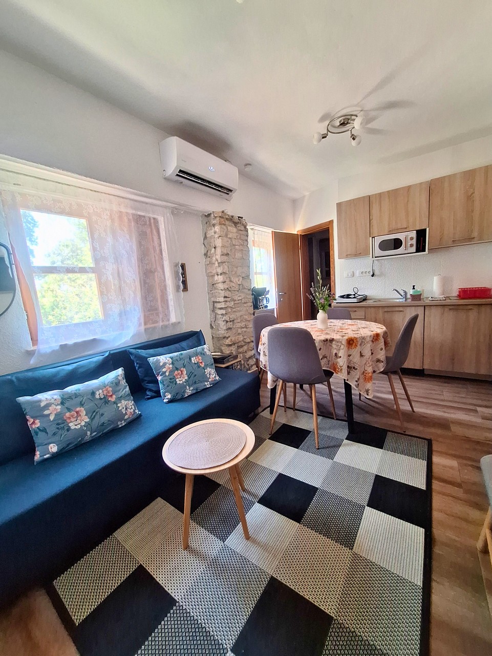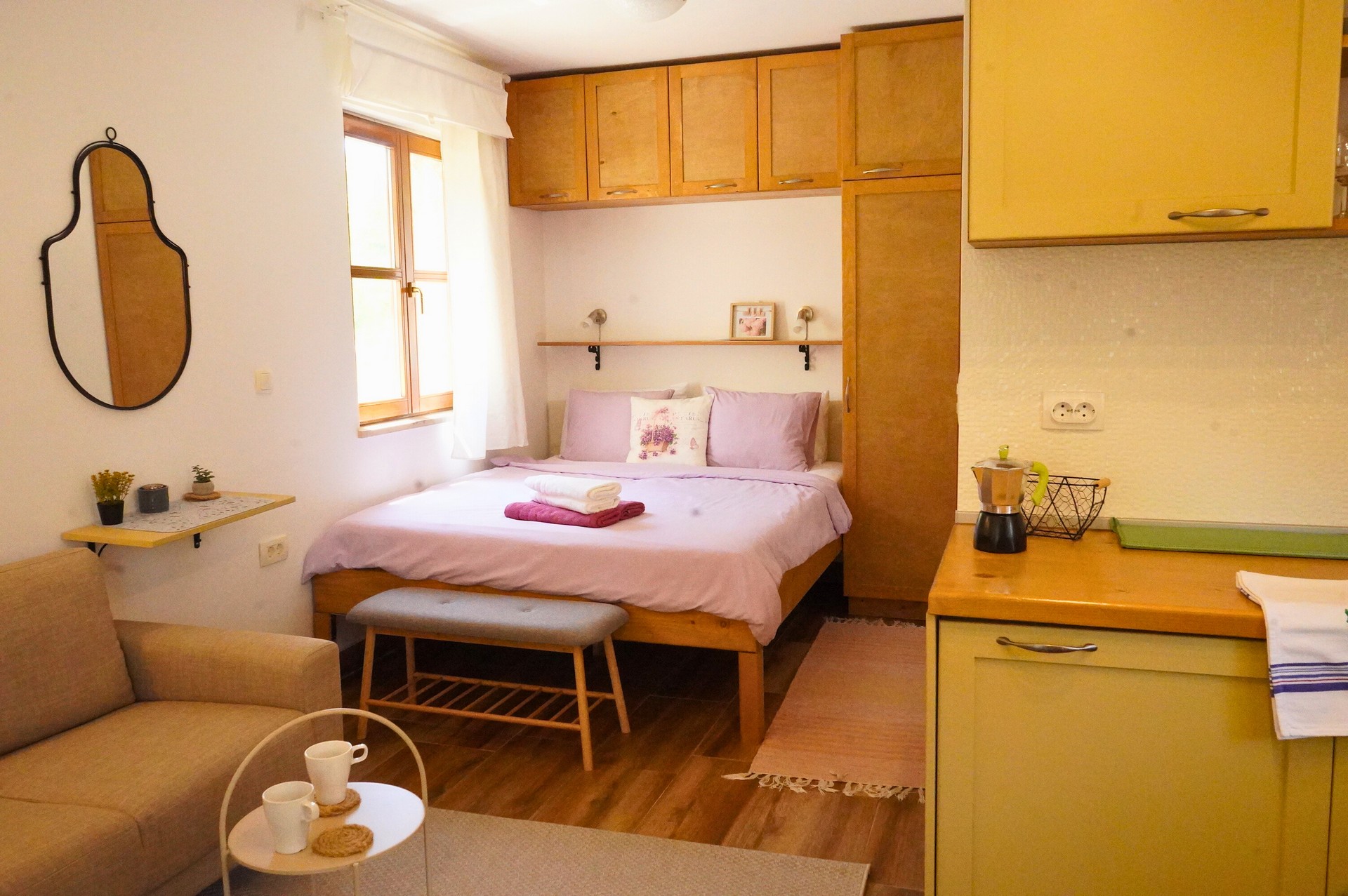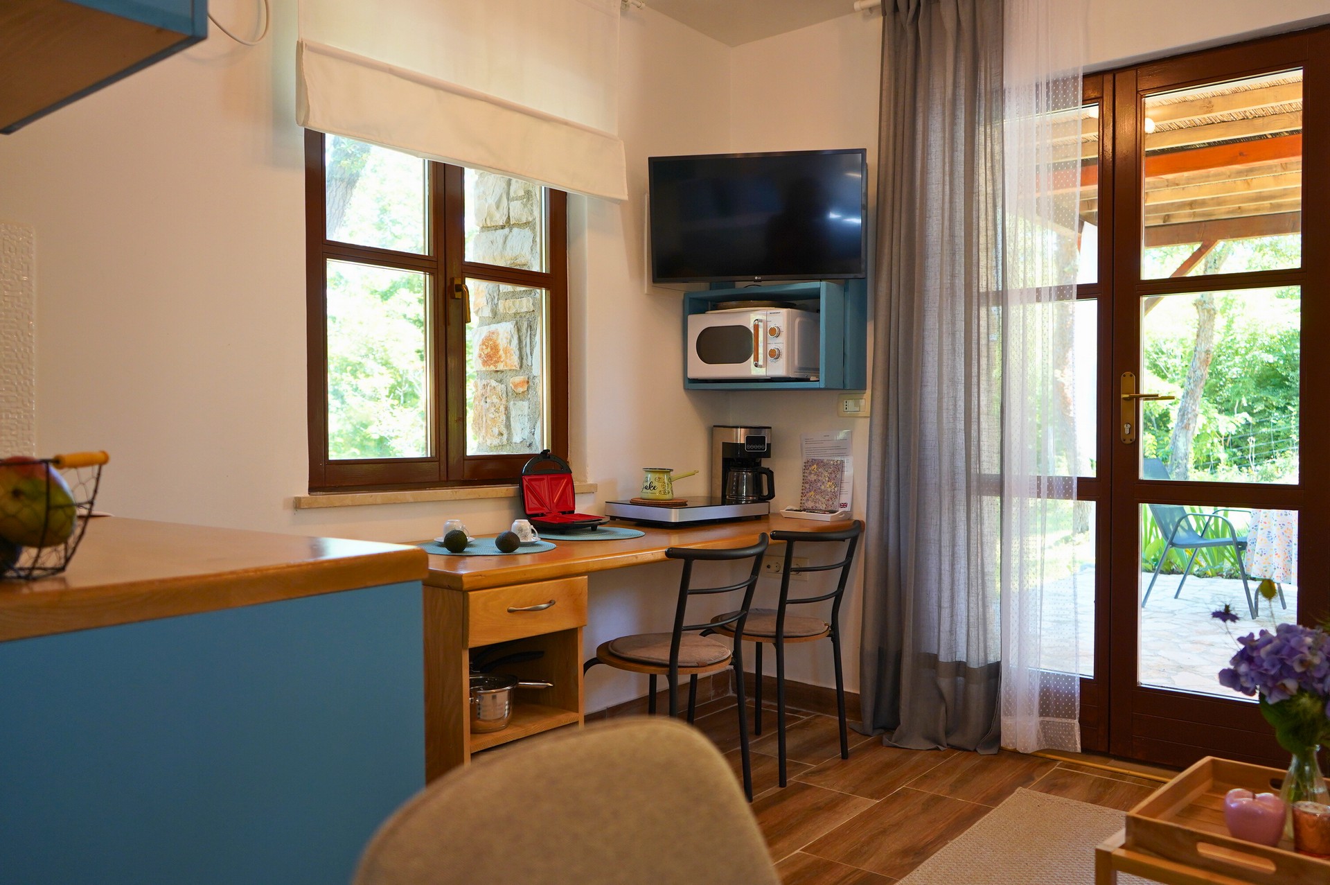 Apartment Mare is 26.37 m² and suitable for 2 guests. It consists of a combined living room and bedroom, kitchen, and bathroom. Equipped with air conditioning, Wi-Fi, and TV with Netflix. The kitchen includes an induction hob, microwave, fridge with freezer, coffee machine, toaster, kettle, dishes, and cutlery. The terrace has garden furniture.