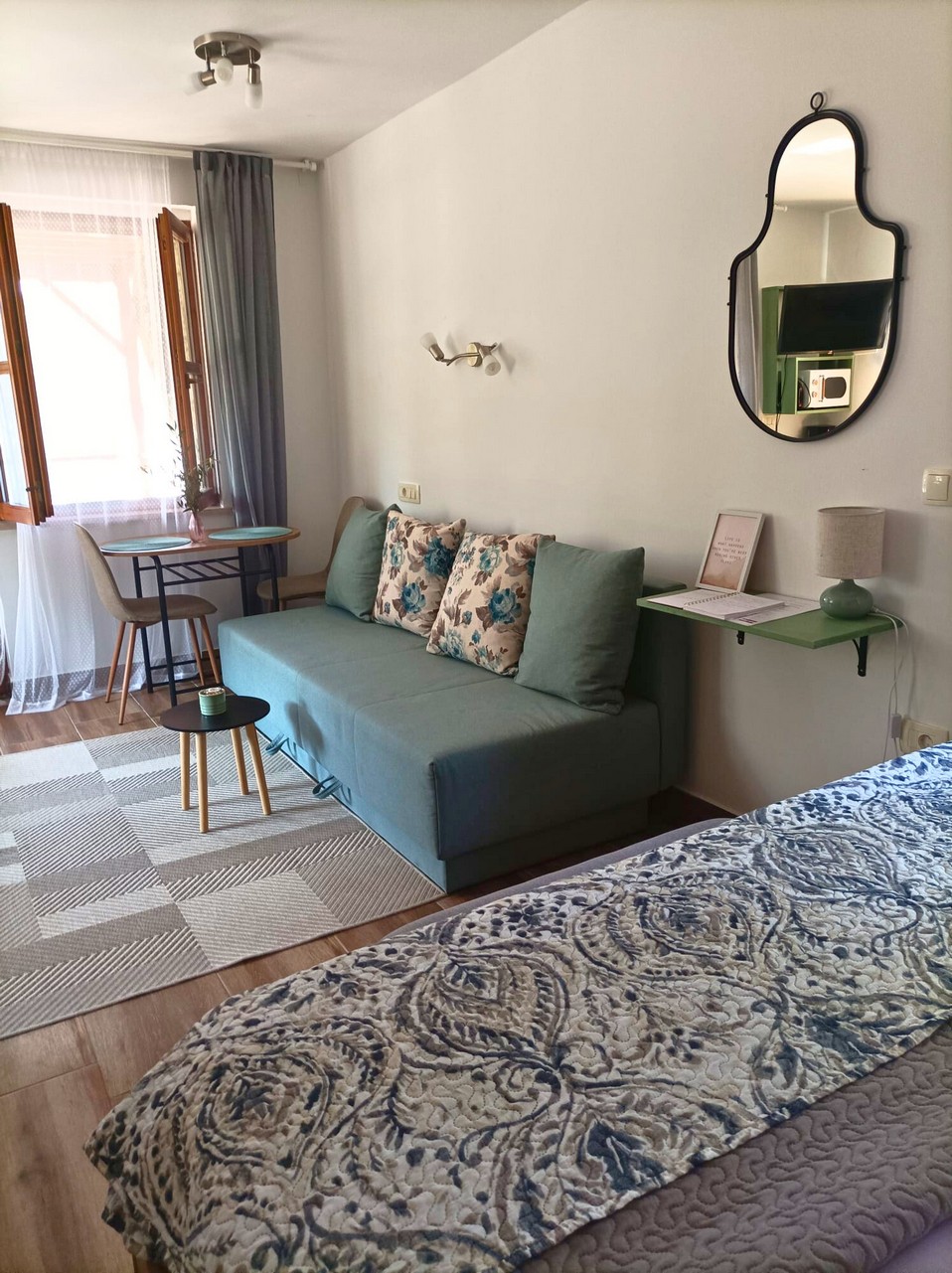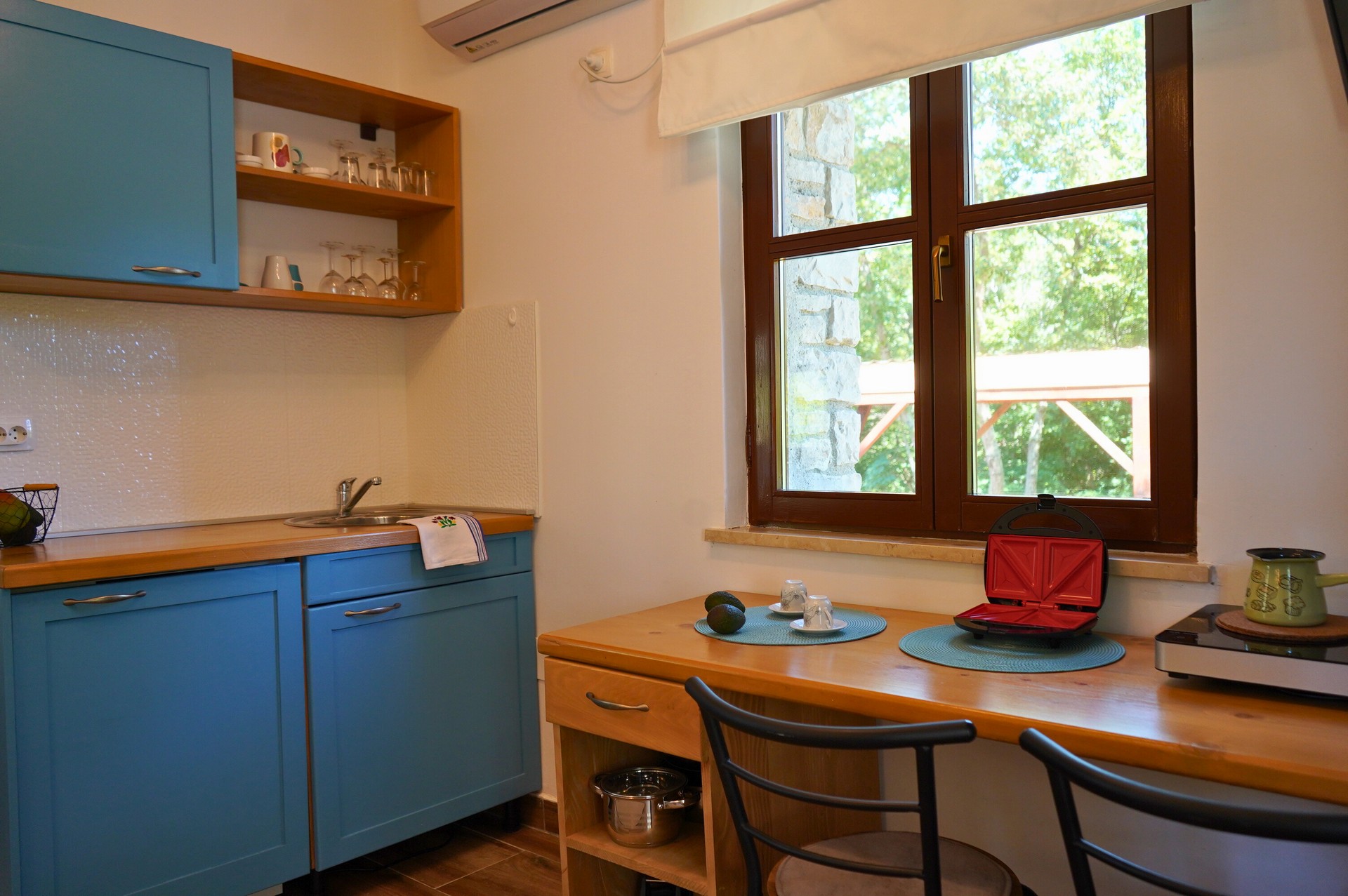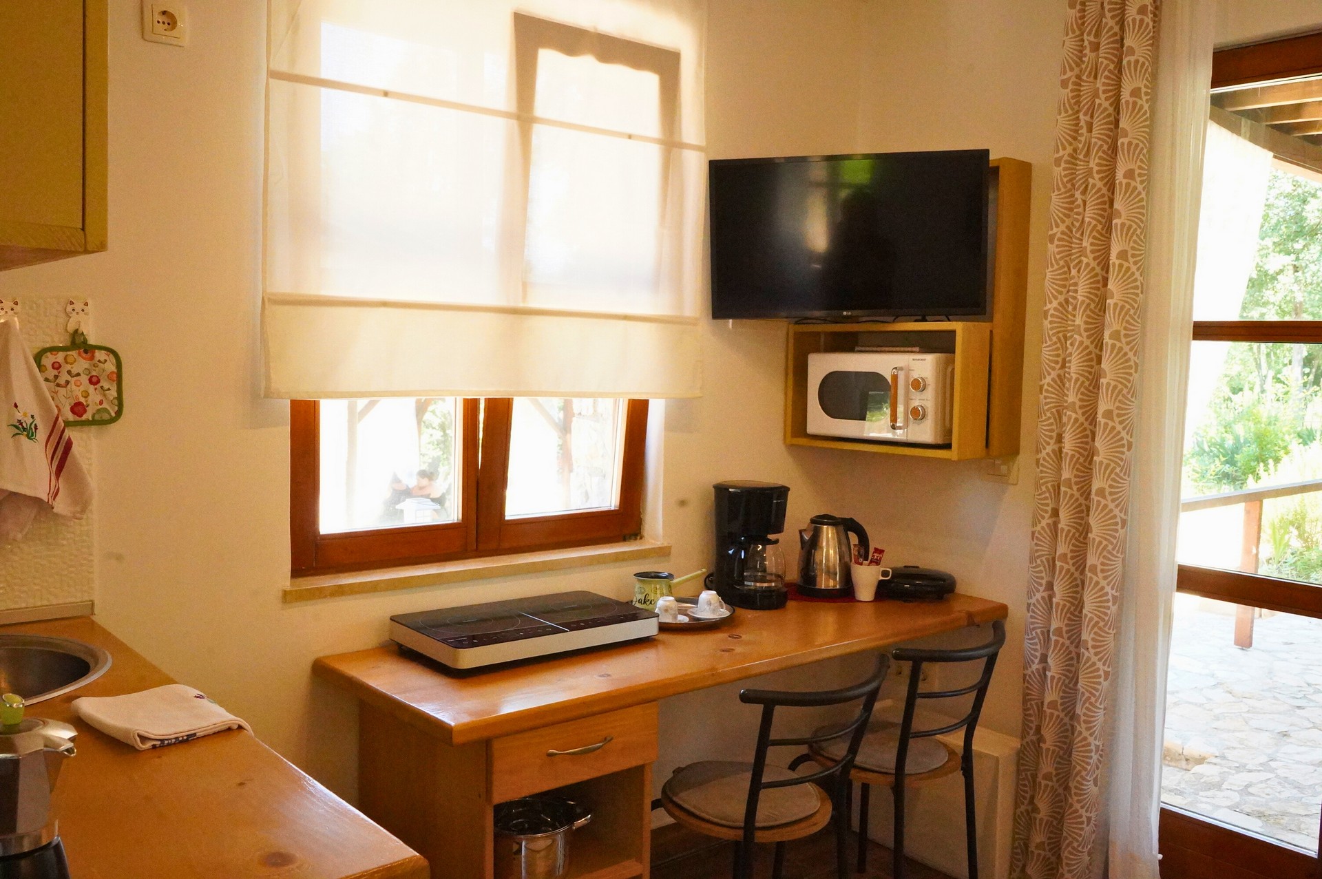 Apartment Mare is 26.37 m² and suitable for 2 guests. It consists of a combined living room and bedroom, kitchen, and bathroom. Equipped with air conditioning, Wi-Fi, and TV with Netflix. The kitchen includes an induction hob, microwave, fridge with freezer, coffee machine, toaster, kettle, dishes, and cutlery. The terrace has garden furniture.