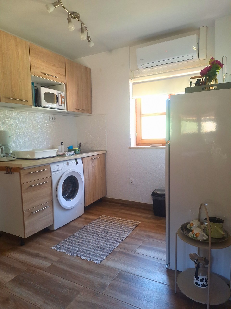Apartment Oasi is 41 m² and suitable for 4 guests. It consists of a living room, kitchen, bathroom, and two bedrooms. Equipped with air conditioning, Wi-Fi, and TV with Netflix. The kitchen includes an induction hob, microwave, fridge with freezer, coffee machine, toaster, kettle, dishes, cutlery, and a washing machine. The terrace has garden furniture.