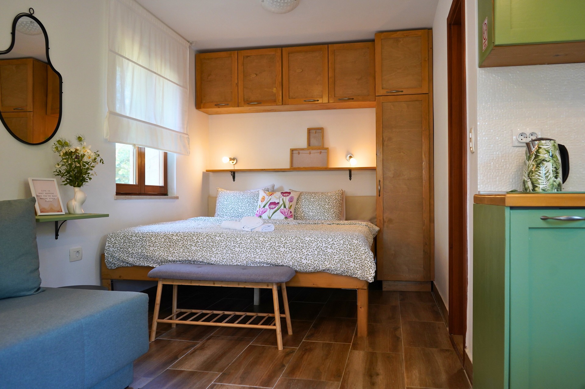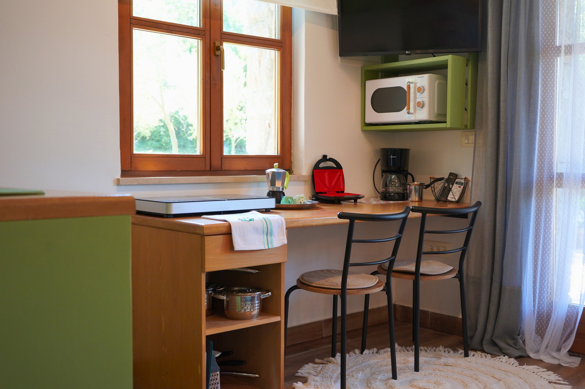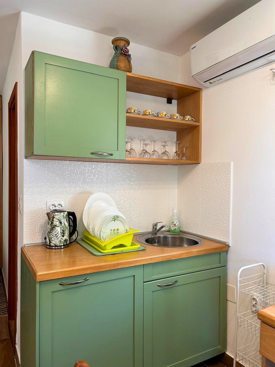 Apartment Olive is 26.1 m² and suitable for 2 guests. It consists of a combined living room and bedroom, kitchen, and bathroom. Equipped with air conditioning, Wi-Fi, and TV with Netflix. The kitchen includes an induction hob, microwave, fridge with freezer, coffee machine, toaster, kettle, dishes, and cutlery. The terrace has garden furniture.