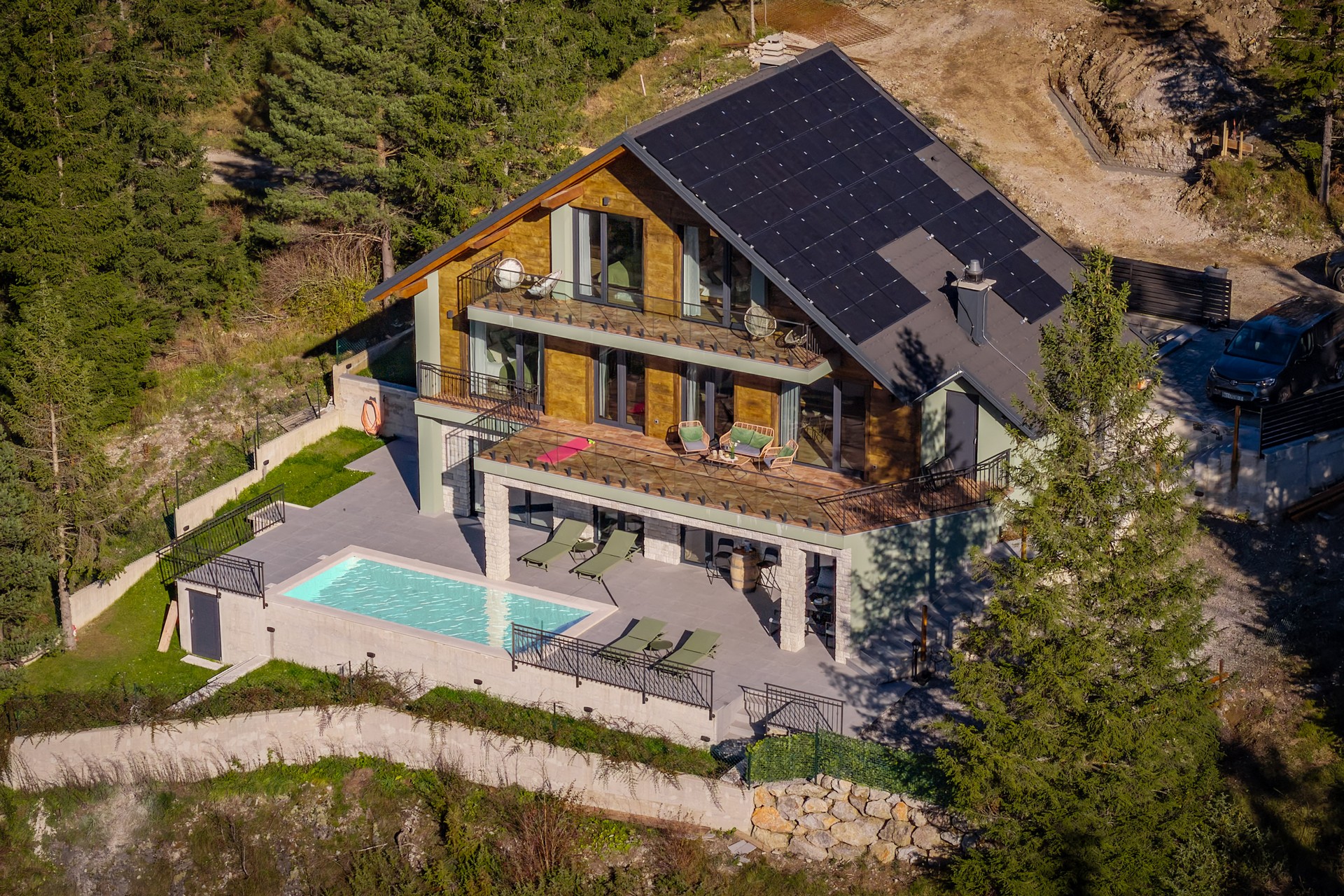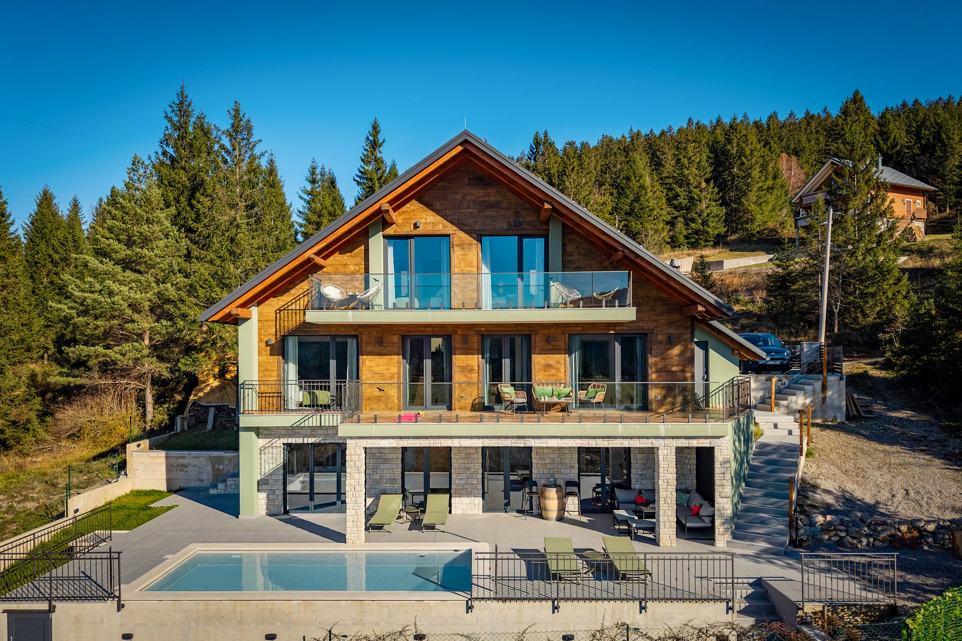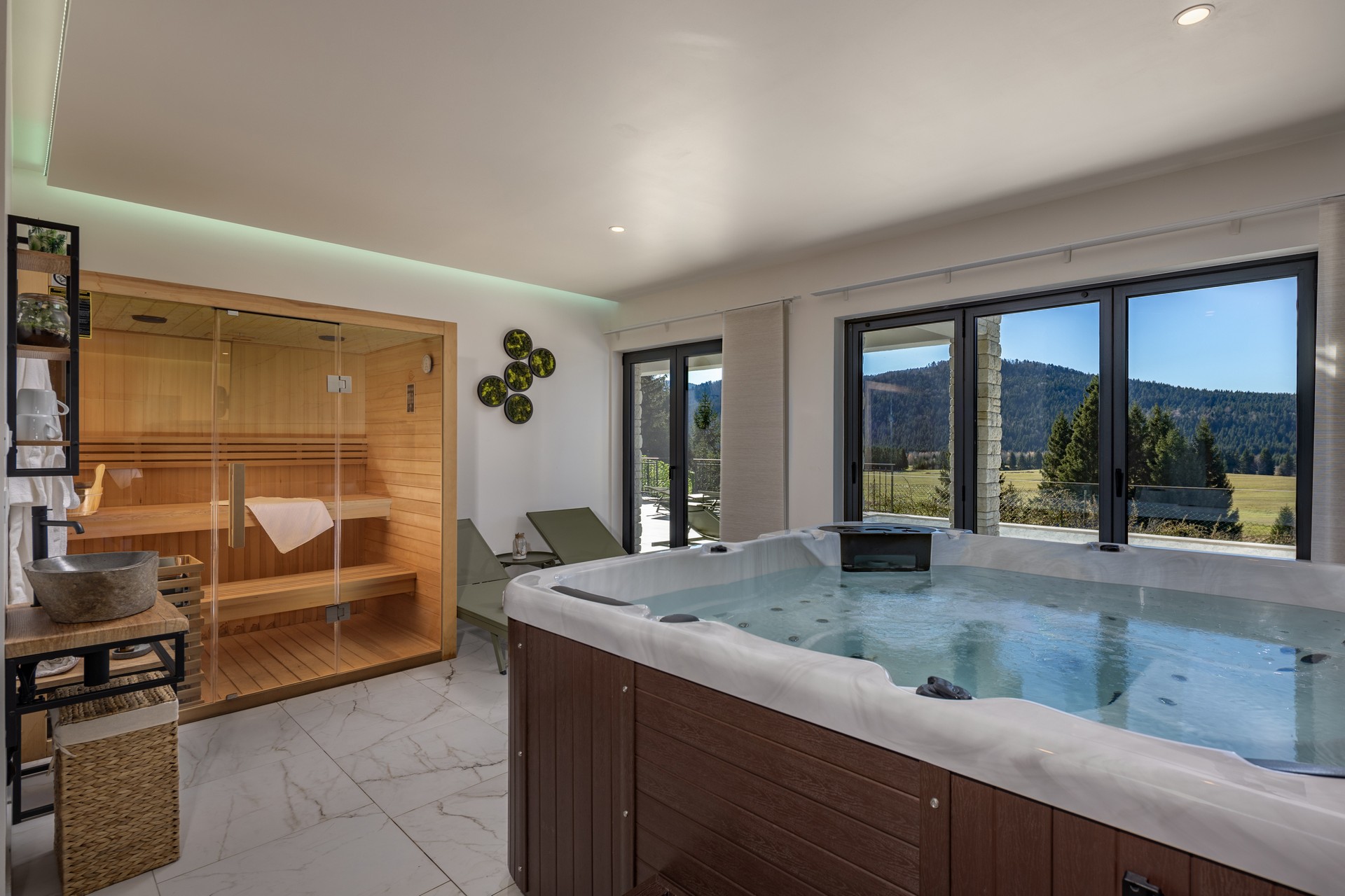The property includes an indoor wellness area with a sauna and a hot tub (jacuzzi), available year-round, an outdoor pool with panoramic views (open from May 1 to October 1), a spacious tavern for socializing, and two large terraces.