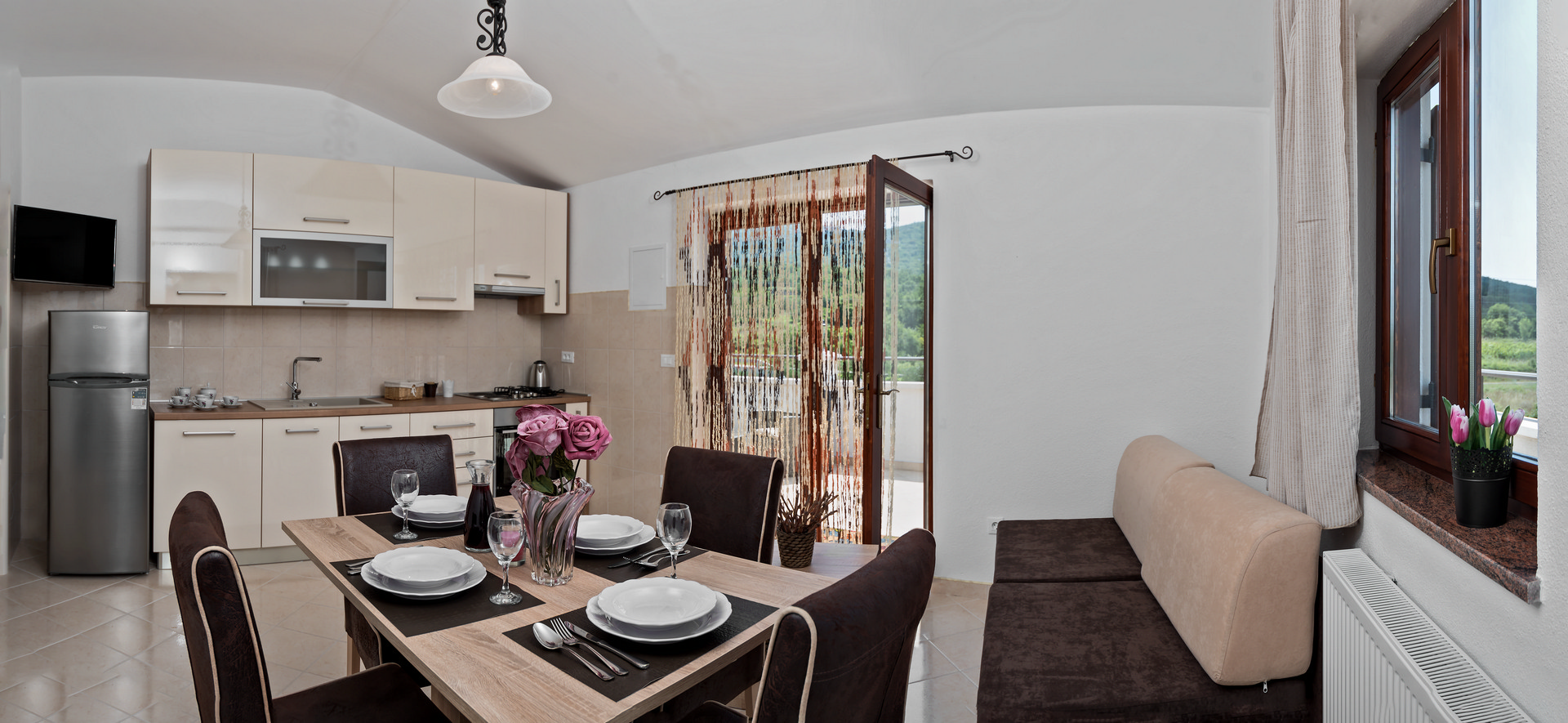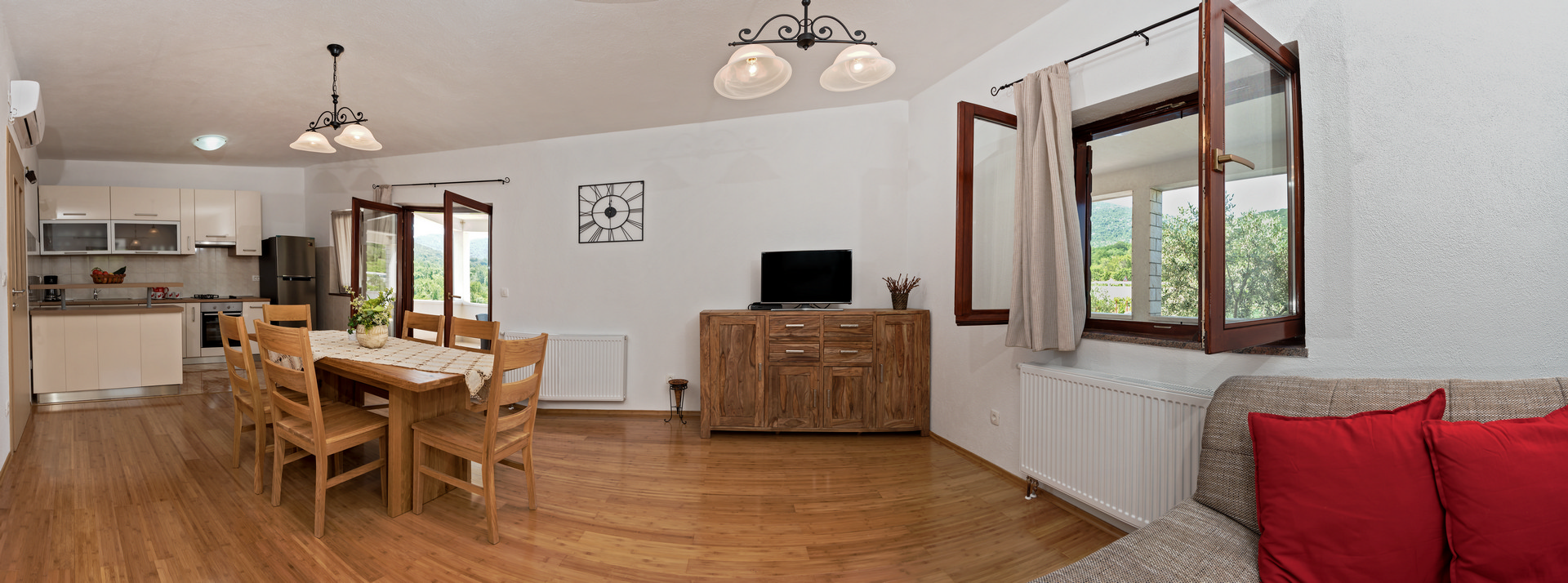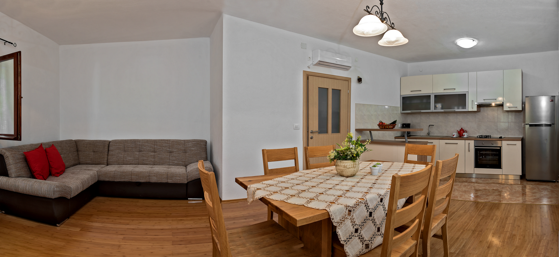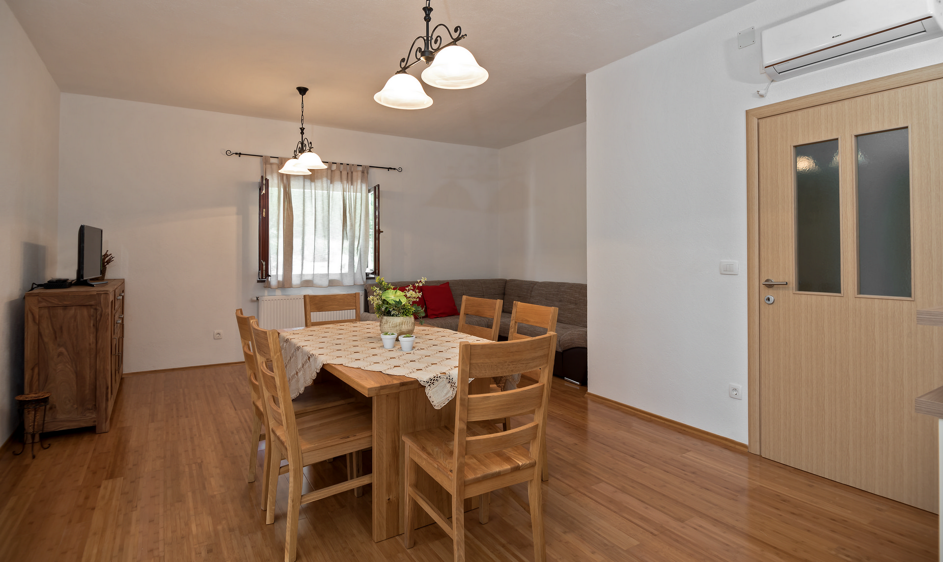 The living area combines a dining space and living room with a sofa bed, flat-screen TV, air conditioning, and a dining table for 4 people. The kitchen corner is equipped with four hot plates, oven, freezer, and electric kettle.