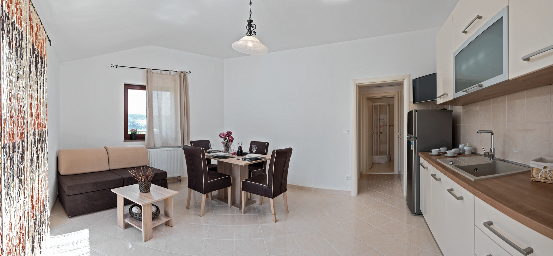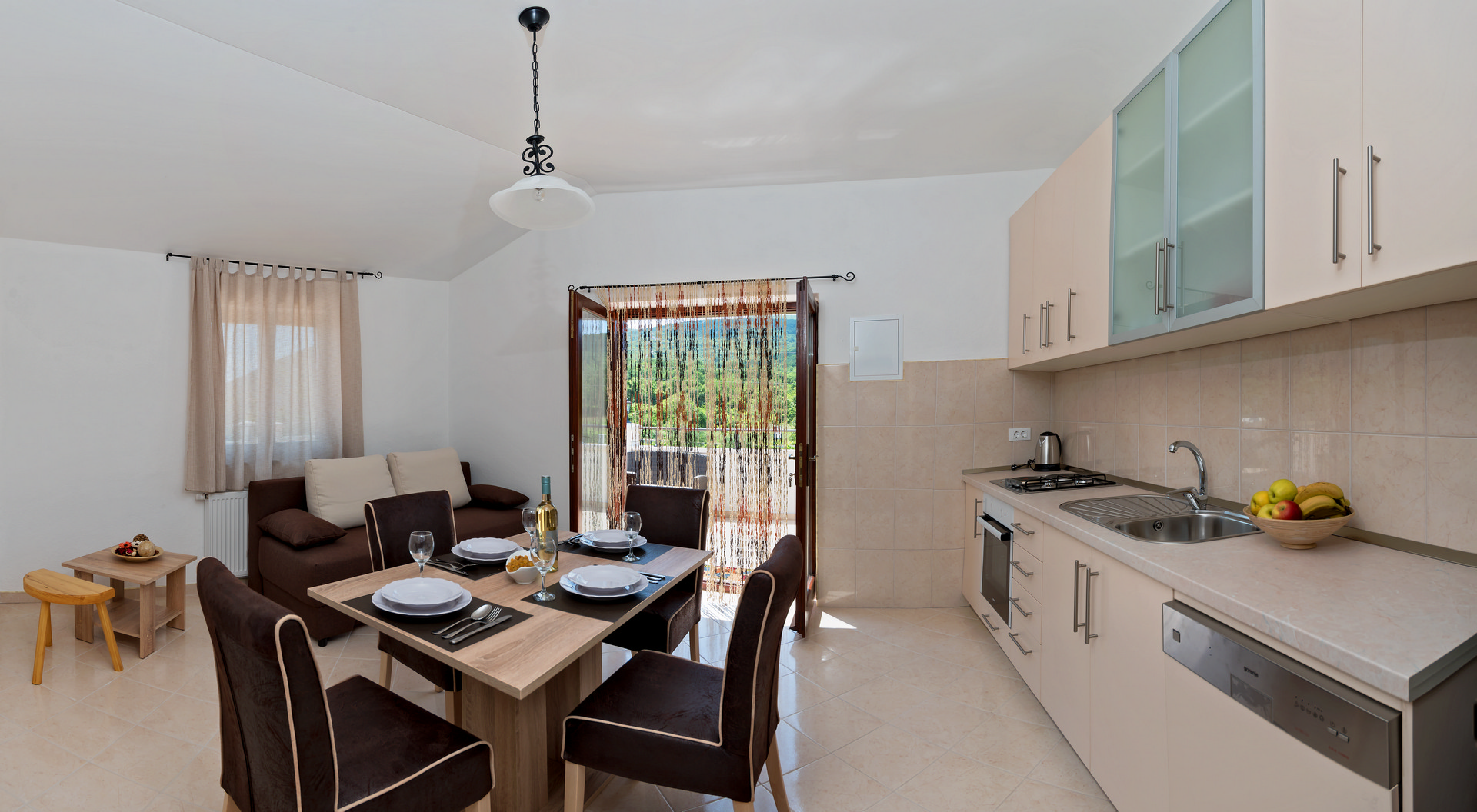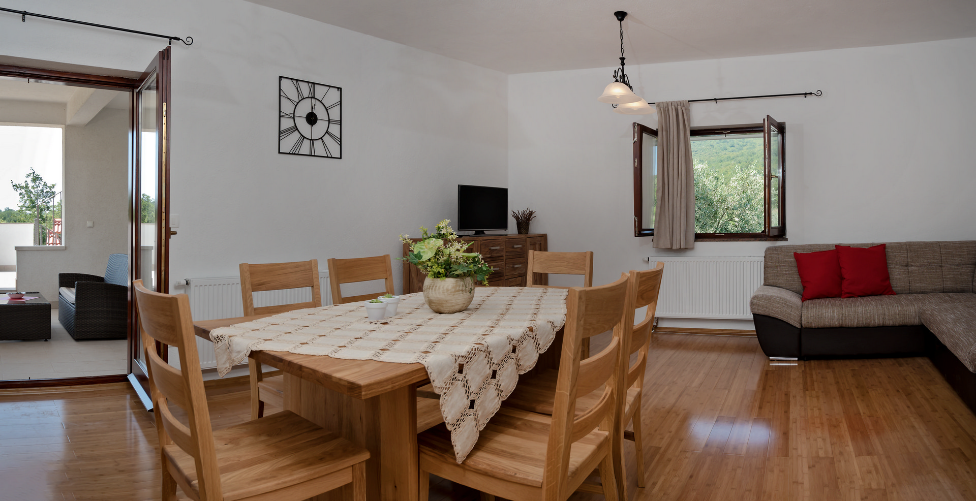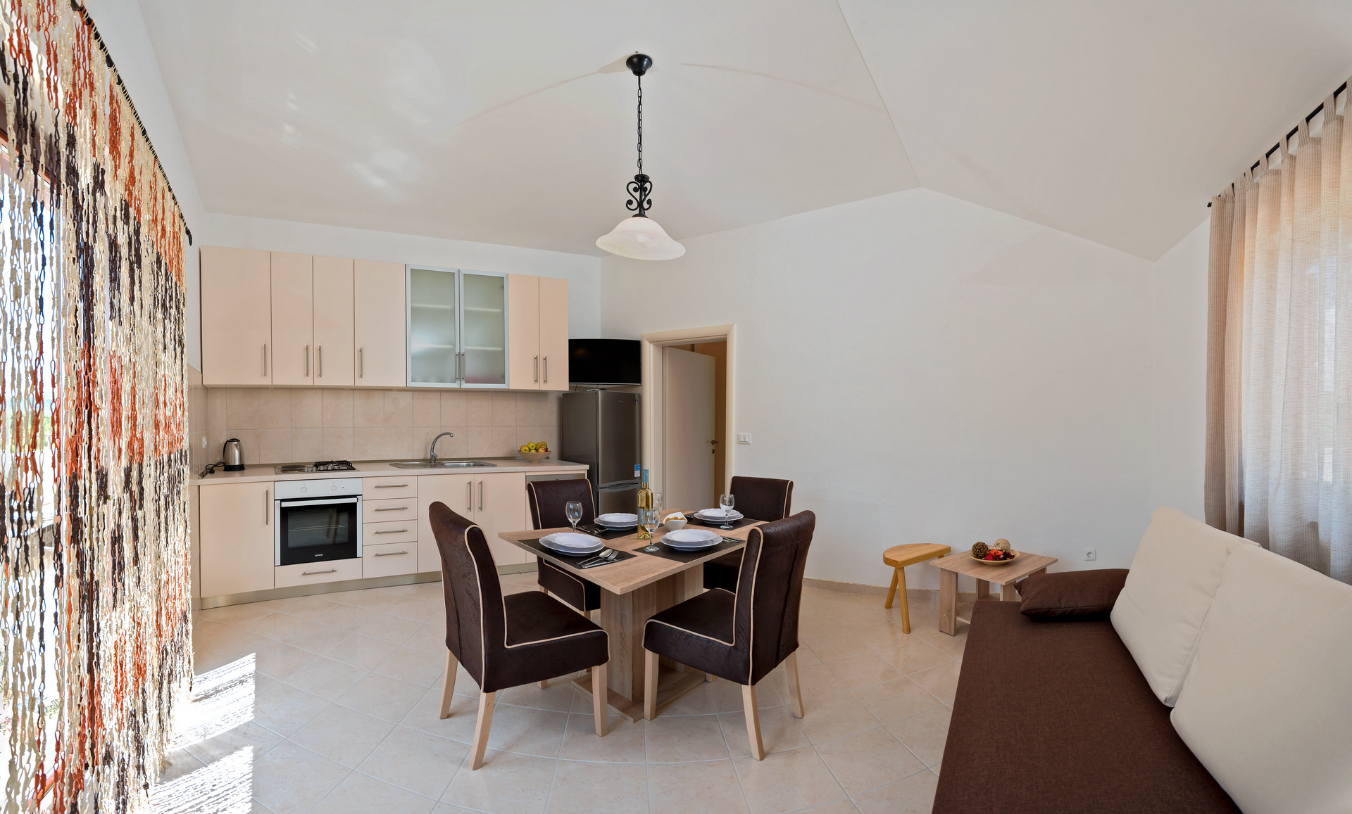 The living area combines a dining space and living room with a sofa bed, flat-screen TV, air conditioning, and a dining table for 4 people. The kitchen corner is equipped with four hot plates, oven, freezer, and electric kettle.