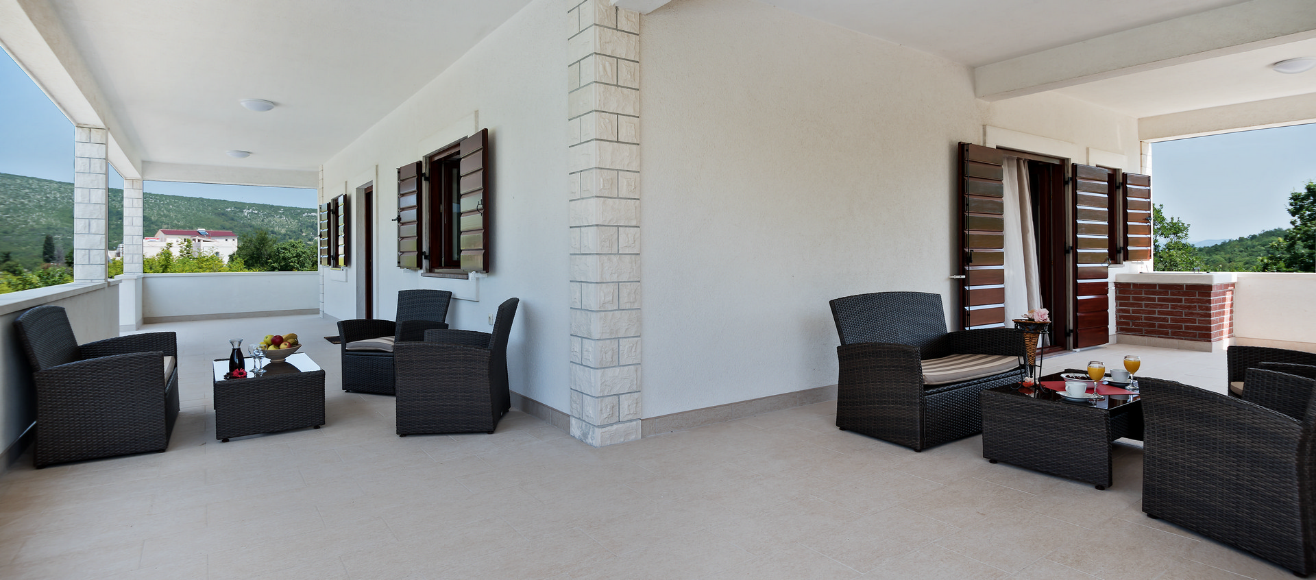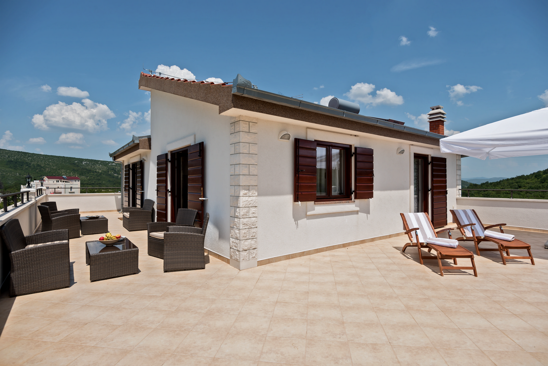 The 80 m² ground floor terrace is equipped with two wooden tables for up to 10 people and deck chairs. The 85 m² covered terrace features comfortable outdoor furniture, deck chairs, and a sun umbrella.