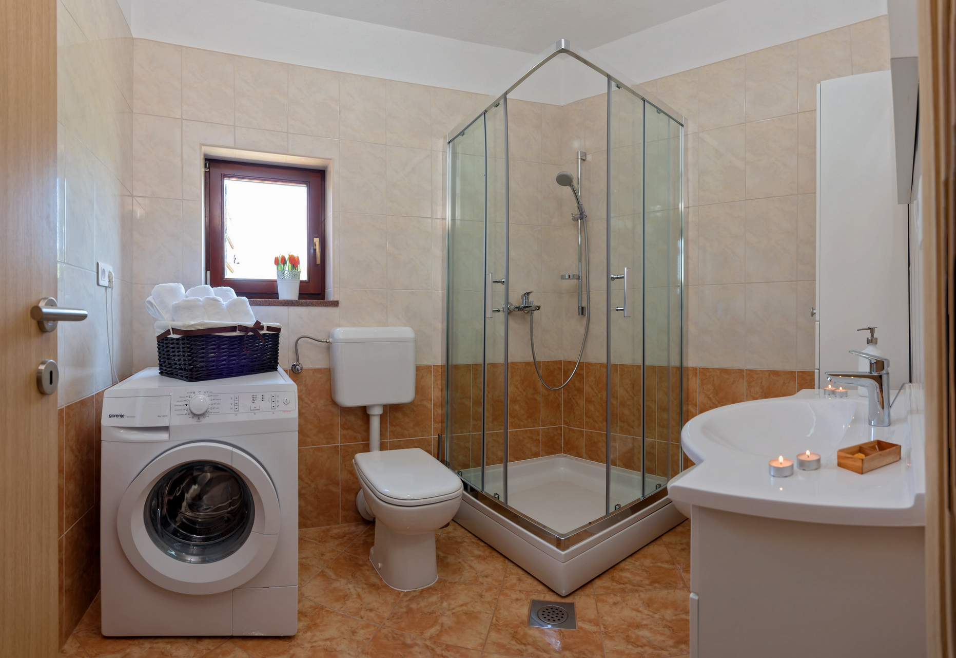 The bathroom includes a shower, washbasin, bidet, toilet, and washing machine.