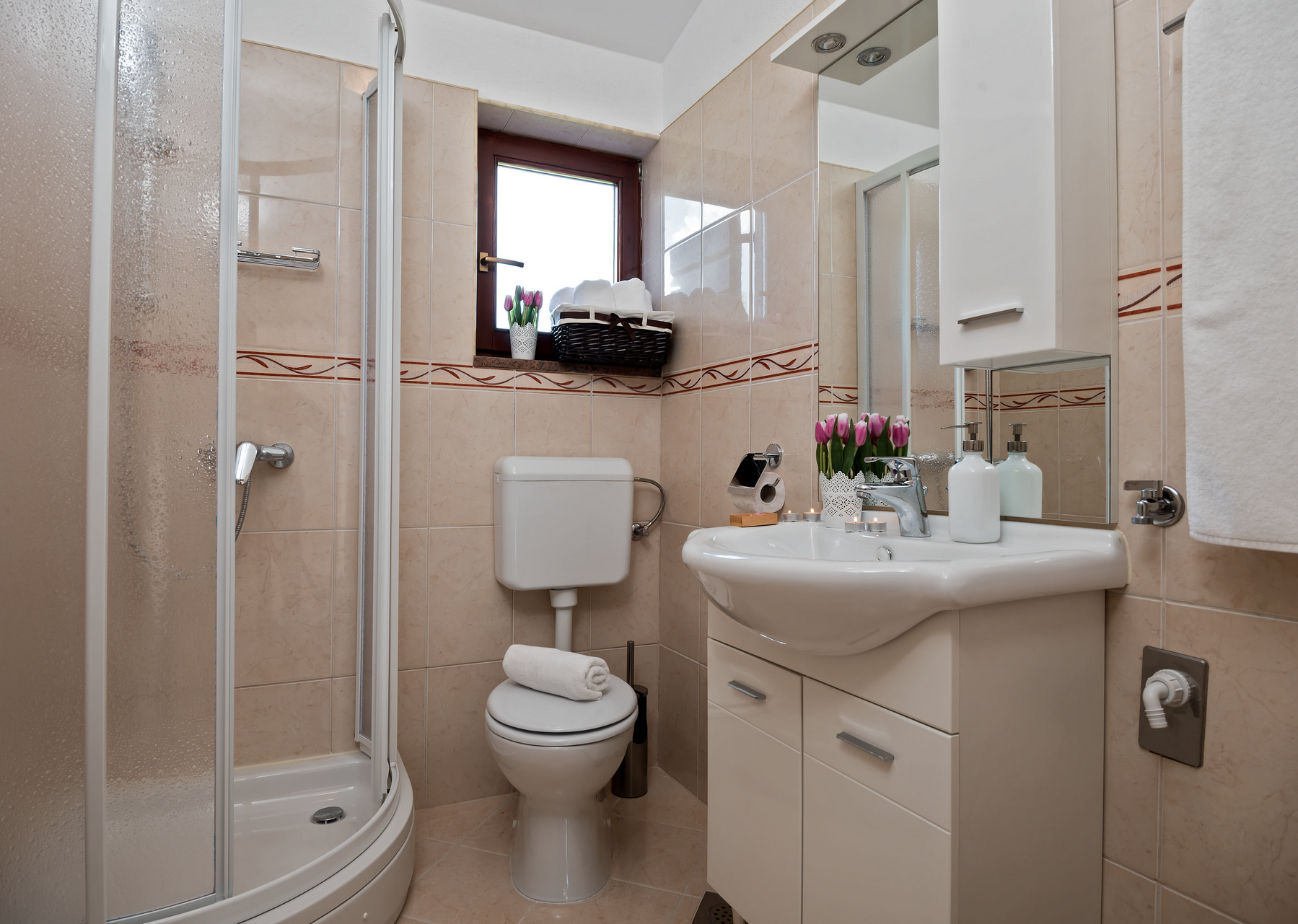 The bathroom includes a shower, washbasin, and toilet.